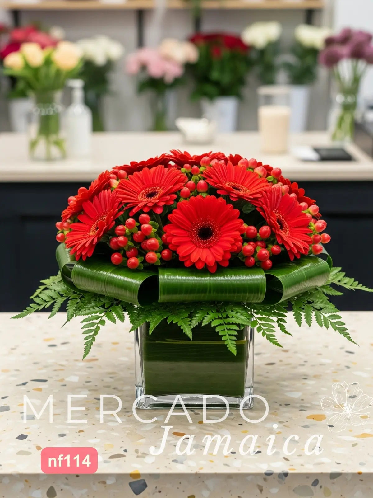 Diseñado para quienes ven las flores como arte, este arreglo une la perfección simétrica de las gerberas con el carácter orgánico del hipericón, todo enmarcado por la pureza de un cubo de vidrio. Las hojas dracenas aportan brillo tropical, mientras los tallos leather introducen texturas inesperadas. Ideal para regalos ejecutivos, decoración de estudios creativos o como declaración de estilo personal.