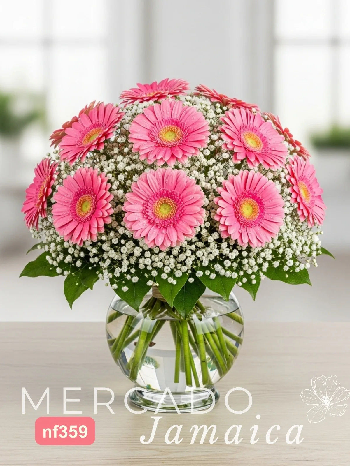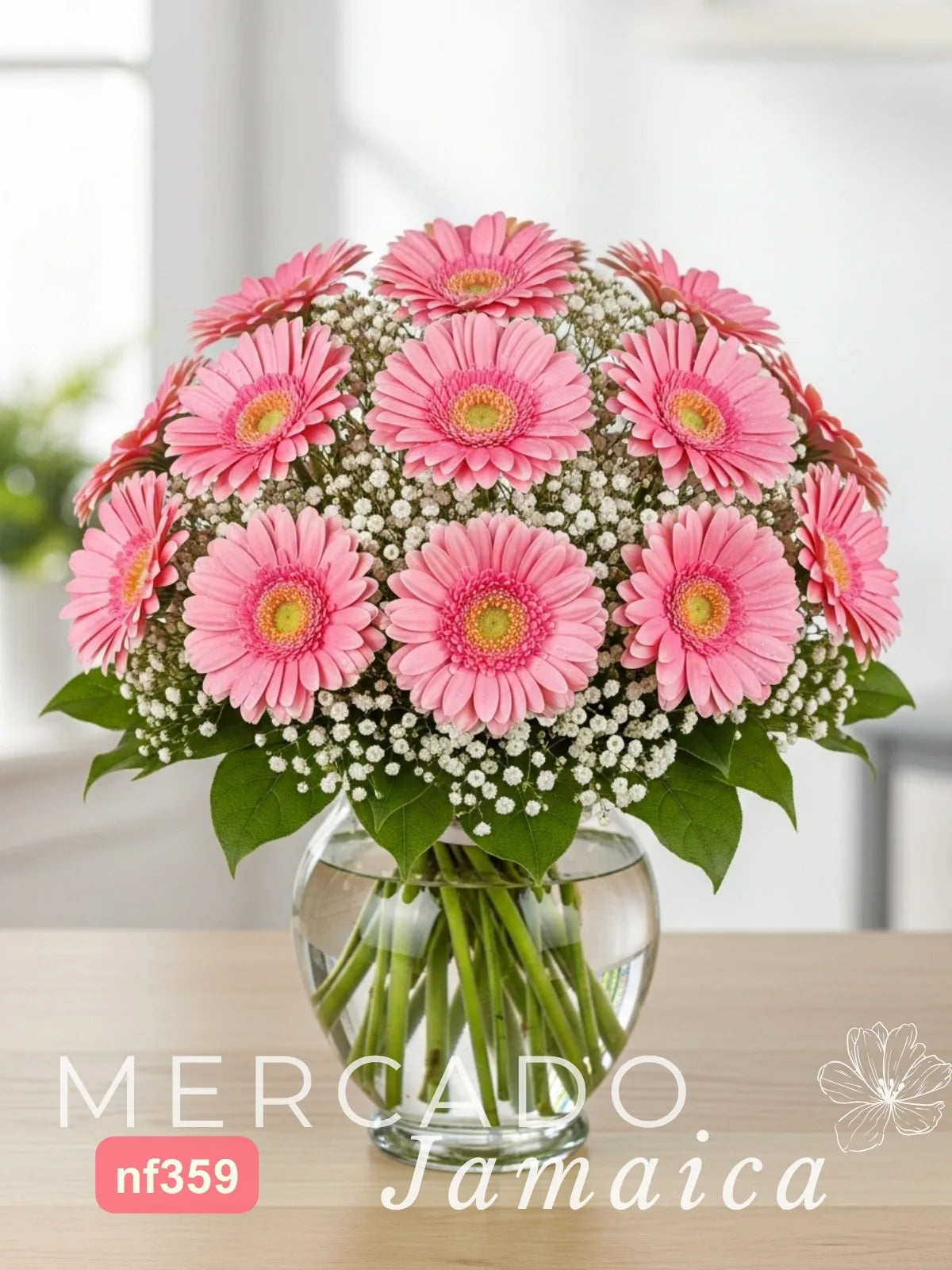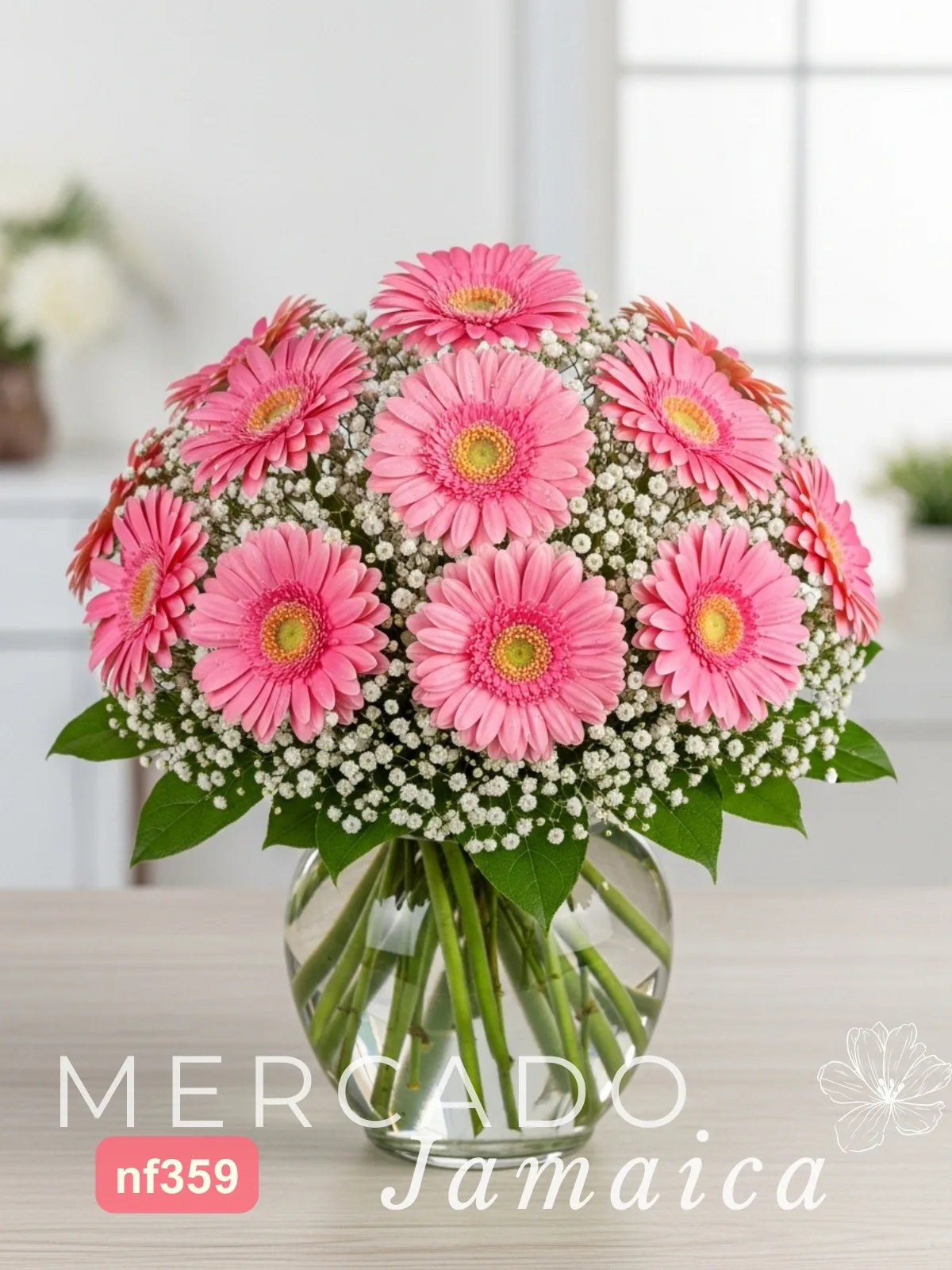 Un arreglo floral vibrante que captura la ternura y la feminidad con una combinación de colores suaves y delicados. Diez gerberas rosa simbolizan la admiración y el aprecio, mientras que la gypsophilia añade un toque de pureza y delicadeza. El diseño se presenta en un florero de vidrio tipo jarrón, un estilo clásico y elegante que se adapta a cualquier ambiente. Es el regalo perfecto para celebrar cualquier ocasión especial con un estilo lleno de vida.