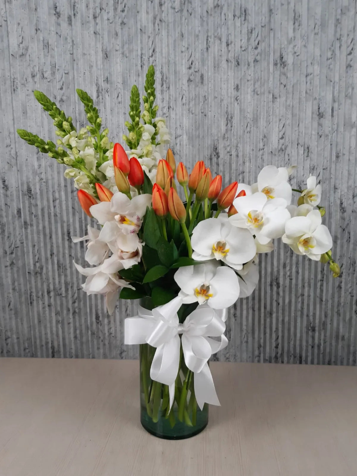 Hermoso arreglo floral con diseño único, flores frescas, delicados tulipanes y orquídeas dos variedades cymbidium y phalaenopsis.