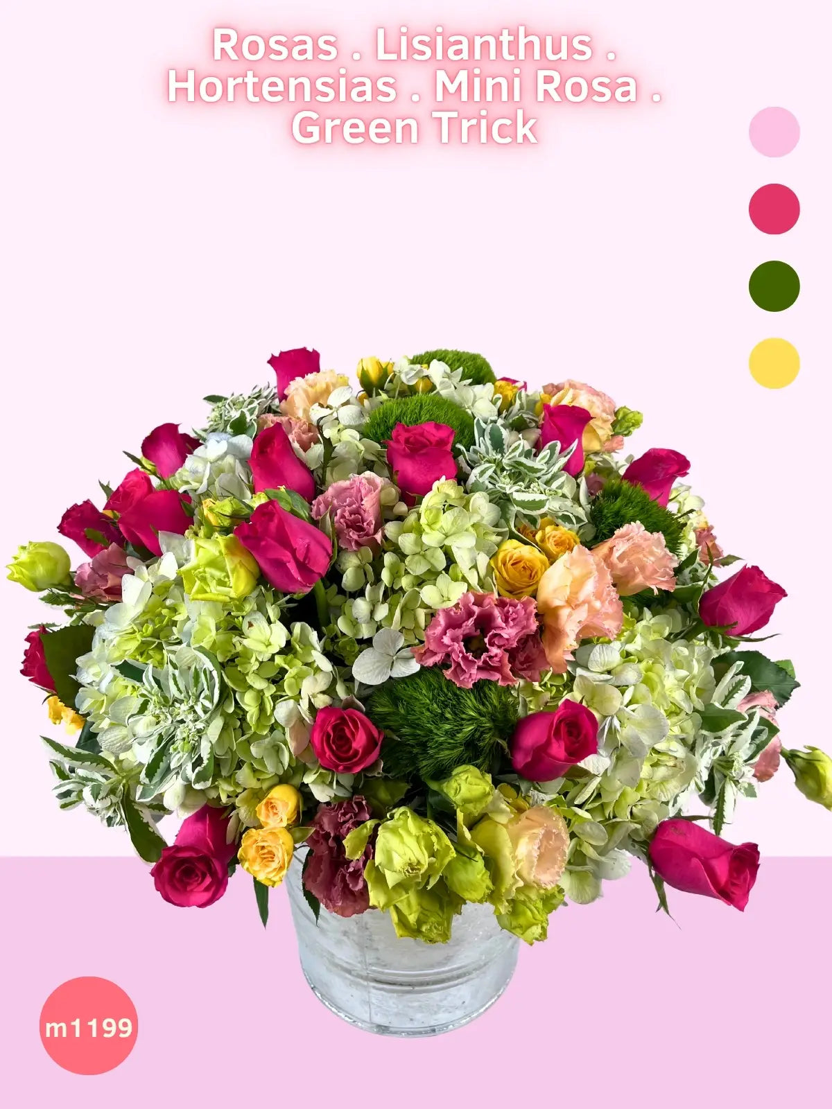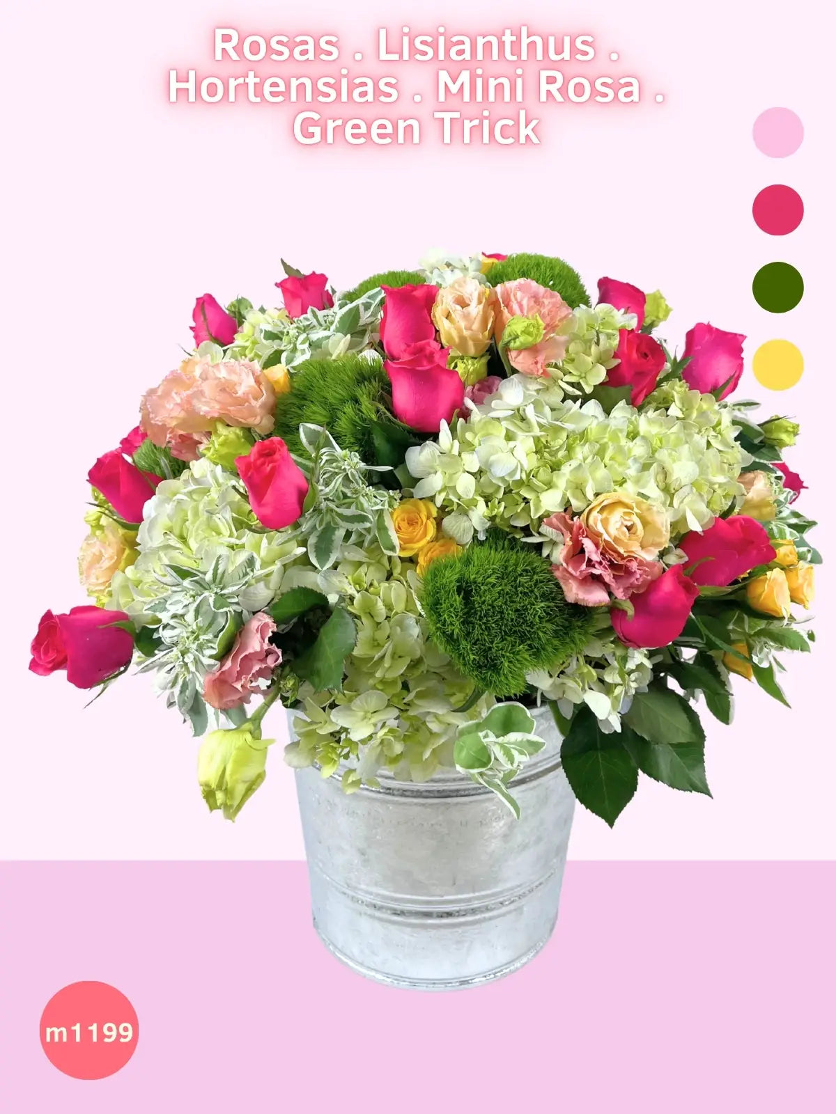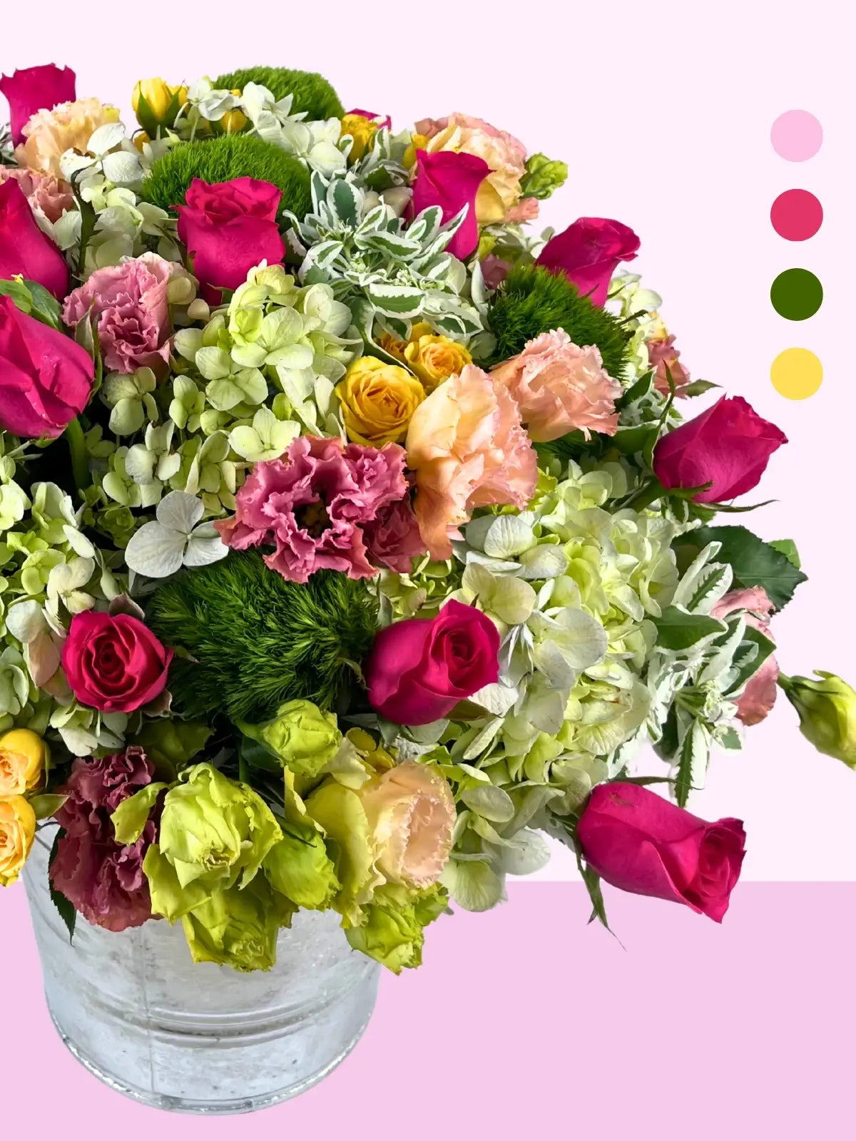 Entra en un mundo de armonía con nuestro hermoso arreglo floral. Doce tallos de rosas amarillas y fucsia se unen con lisianthus rosa, hortensias verdes y fino follaje Green Tree en un cubo mediano laminado.