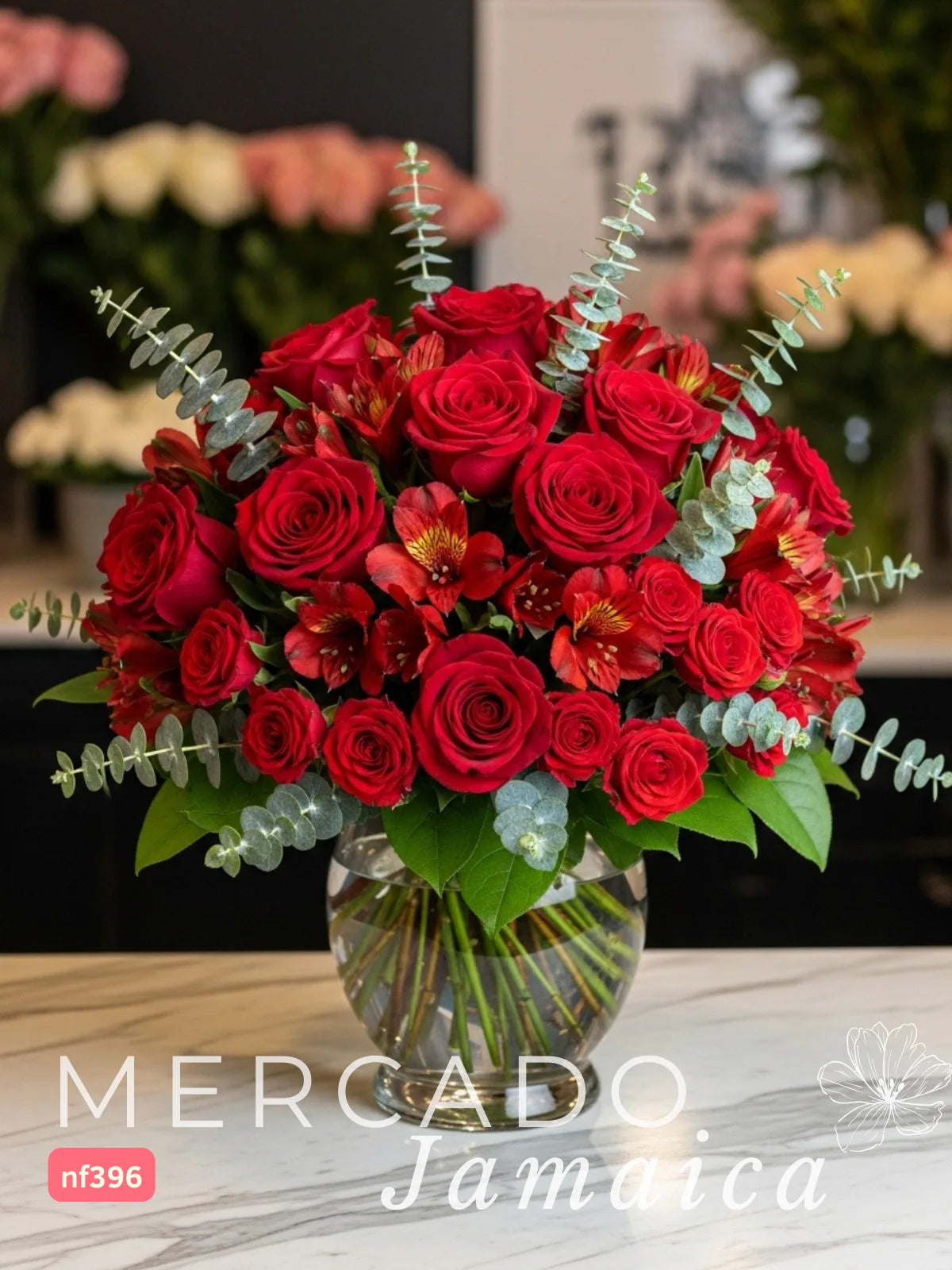 Un arreglo floral que evoca la pasión en su máxima expresión con una vibrante combinación de texturas. Veinticuatro rosas rojas simbolizan el amor profundo, mientras que diez alstroemerias rojas y un bounche de mini rosas rojas añaden un toque de encanto y sofisticación. El diseño se complementa con tallos de dólar y follaje de ruscus, que añaden un toque rústico y natural. Todo el conjunto se presenta en un florero de vidrio tipo jarrón, ideal para un regalo inolvidable.