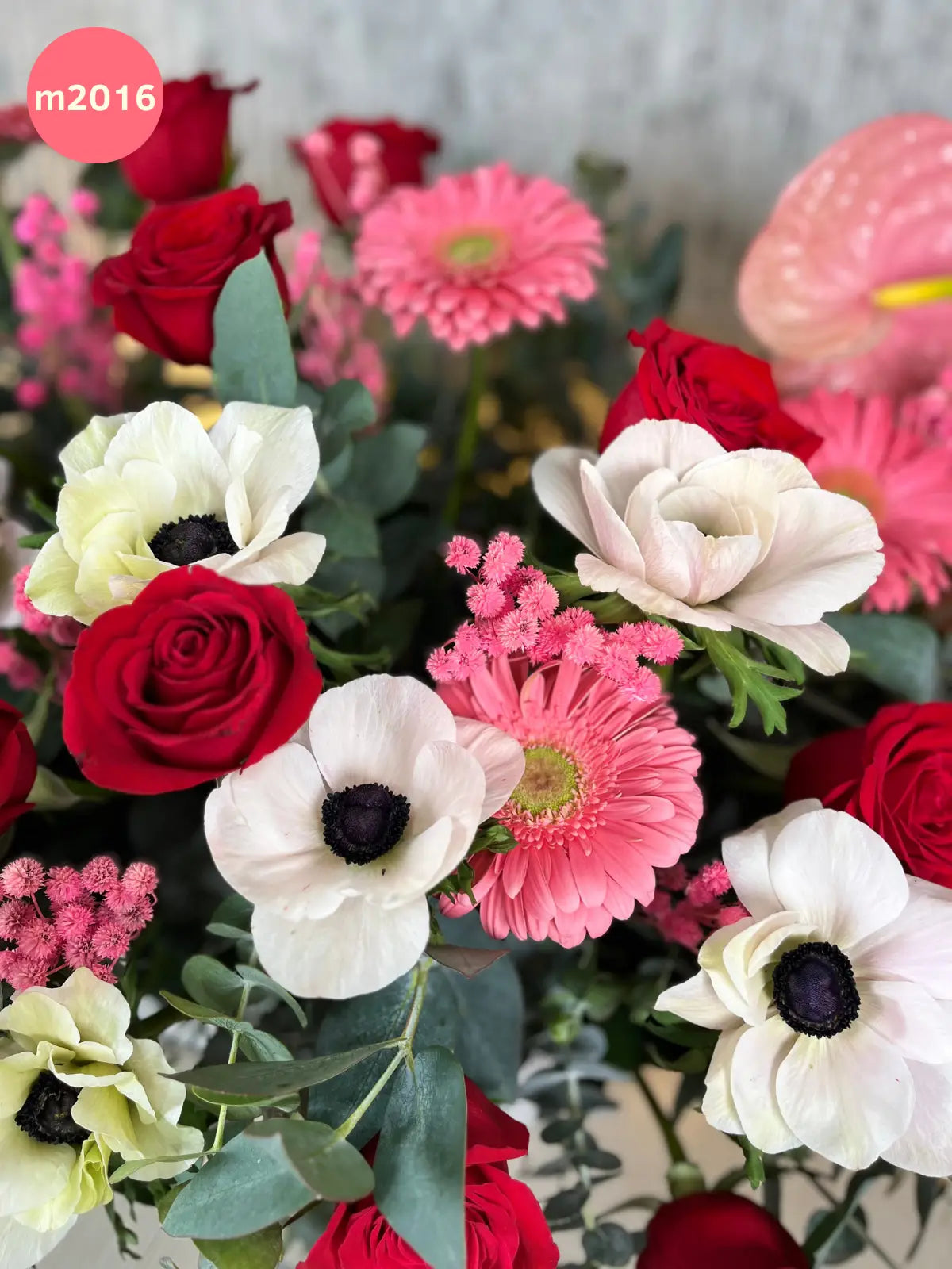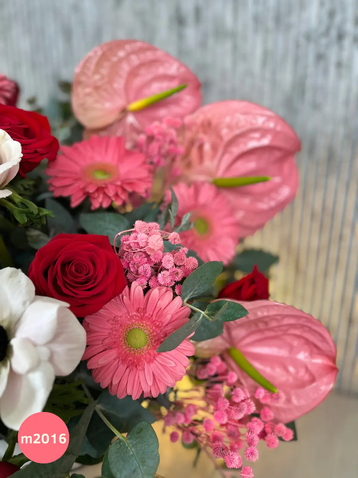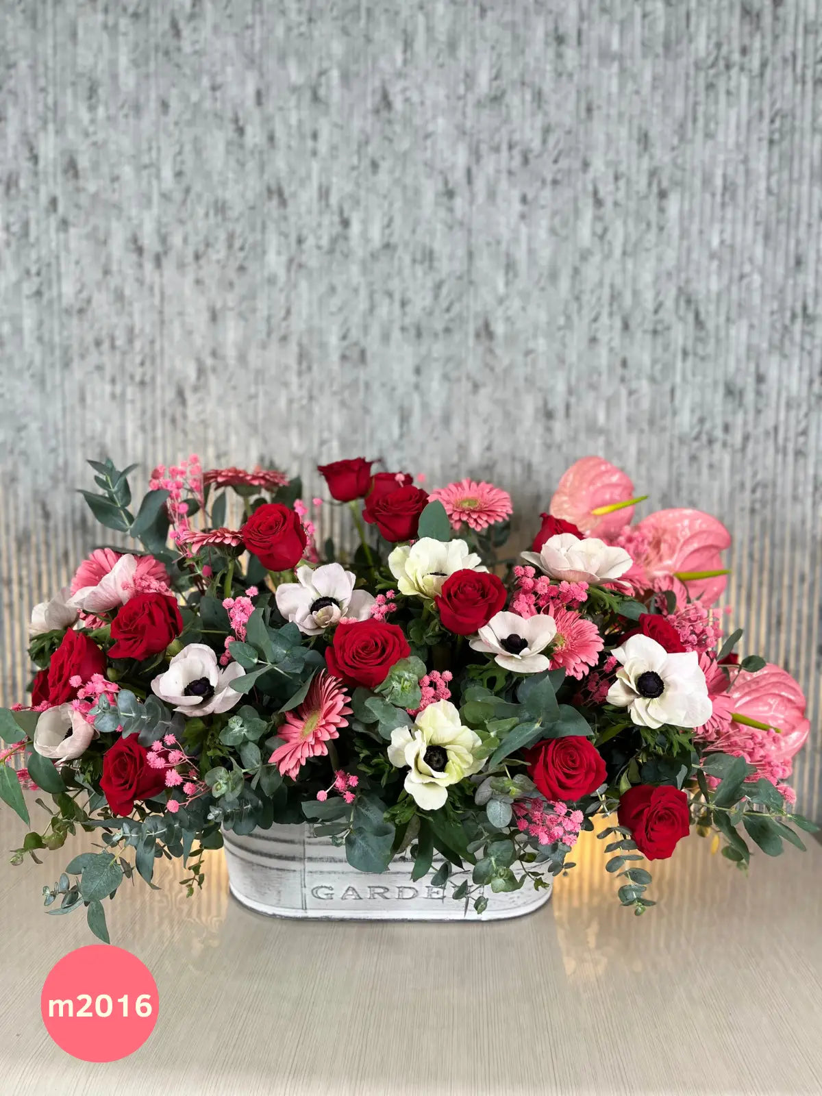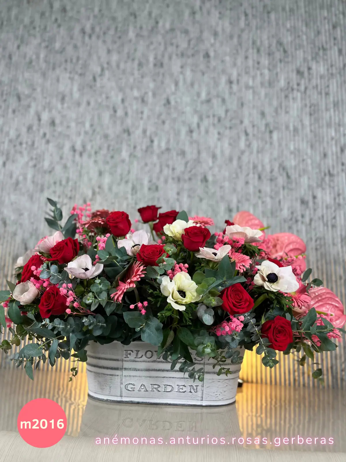 Compuesto por 10 anémonas, 24 rosas rojas, 3 anturios multicolor, 10 gerberas rosas y follajes como dólar y eucalipto, este arreglo se completa con varitas decorativas secas. Presentado en una cerámica jardinera, evoca la belleza de un jardín en flor.