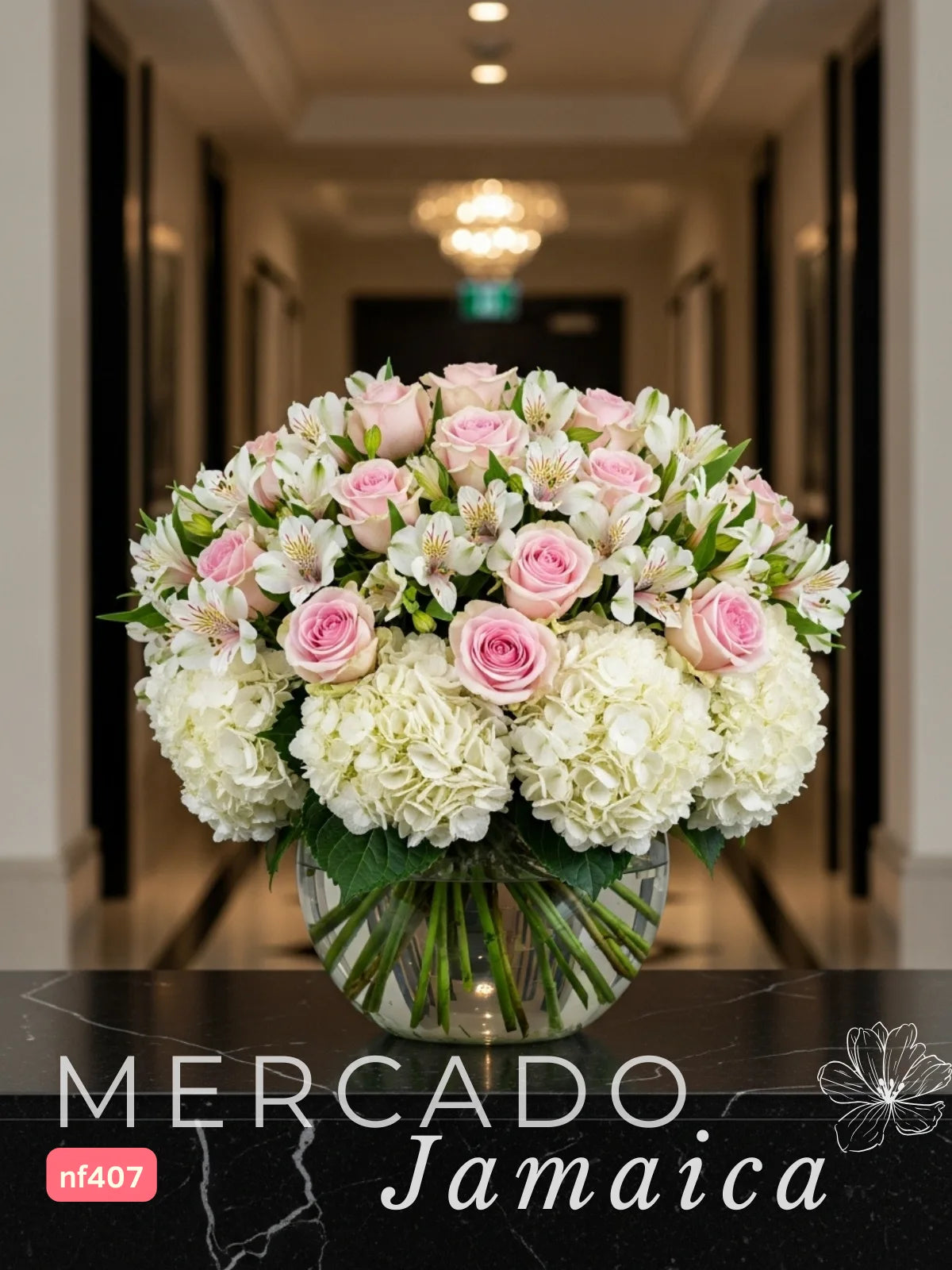 Un arreglo floral que evoca pureza y elegancia con una combinación de tonalidades suaves y delicadas. Cuatro hortensias blancas aportan volumen y un toque de sofisticación, mientras que veinticuatro rosas rosa y diez alstroemerias blancas añaden un toque de ternura y gracia. Todo el conjunto se presenta en una elegante esfera de vidrio, ideal para un regalo memorable o para decorar cualquier espacio con un toque de paz y serenidad.