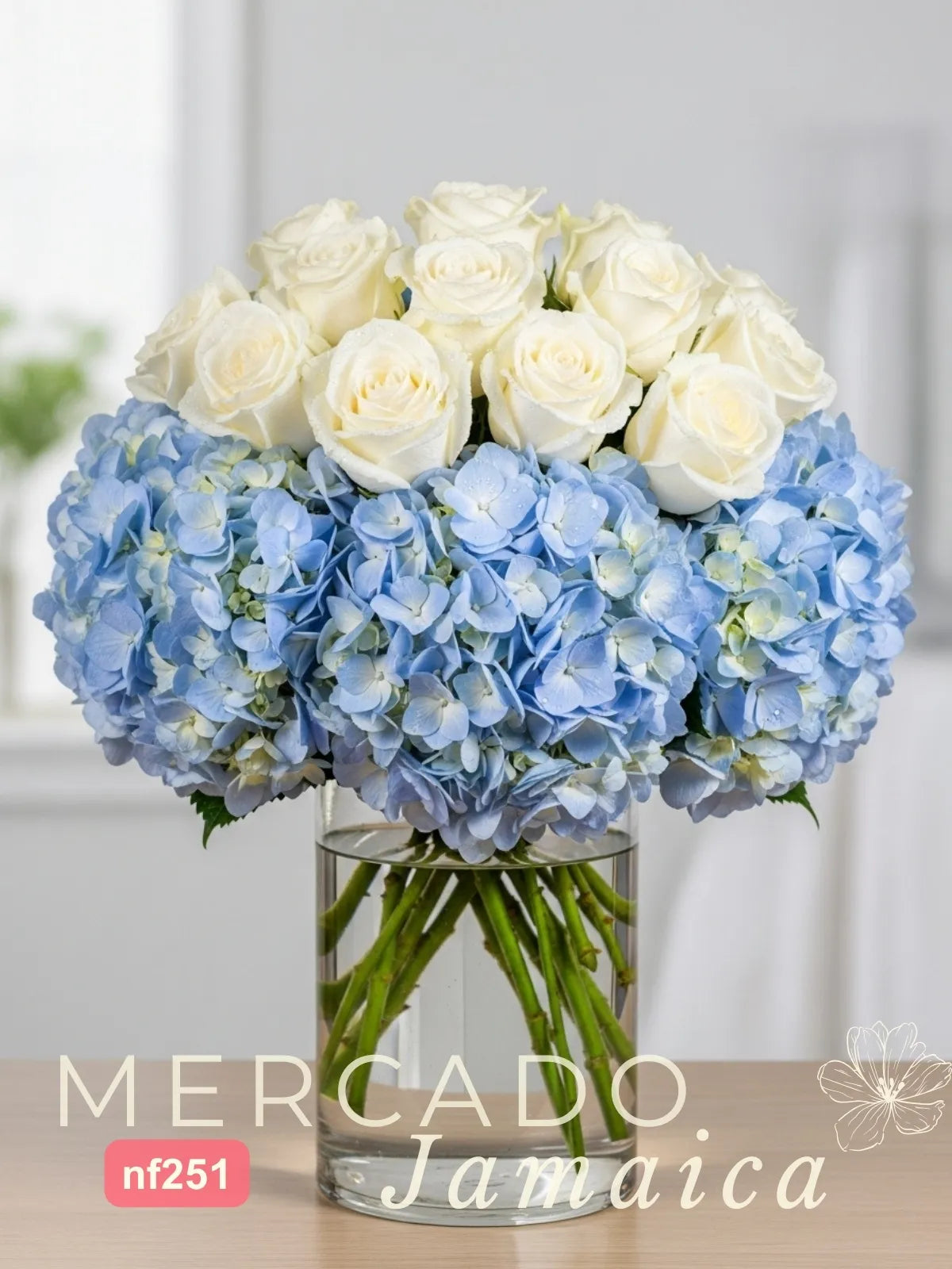 Una base exuberante de hortensias azules, el color icónico de la serenidad, crea una nube de volumen y textura. Este es uno de los pocos azules verdaderos en el mundo floral, aportando un toque de color frío y muy sofisticado. Emergiendo de esta base, dieciocho rosas blancas de variedades premium como 'Mondial', famosas por su espectacular apertura y su blanco puro, añaden el toque de elegancia y perfección clásica. Cada rosa se coloca cuidadosamente para destacar sobre el fondo azul, creando un contraste visualmente impactante y armonioso.