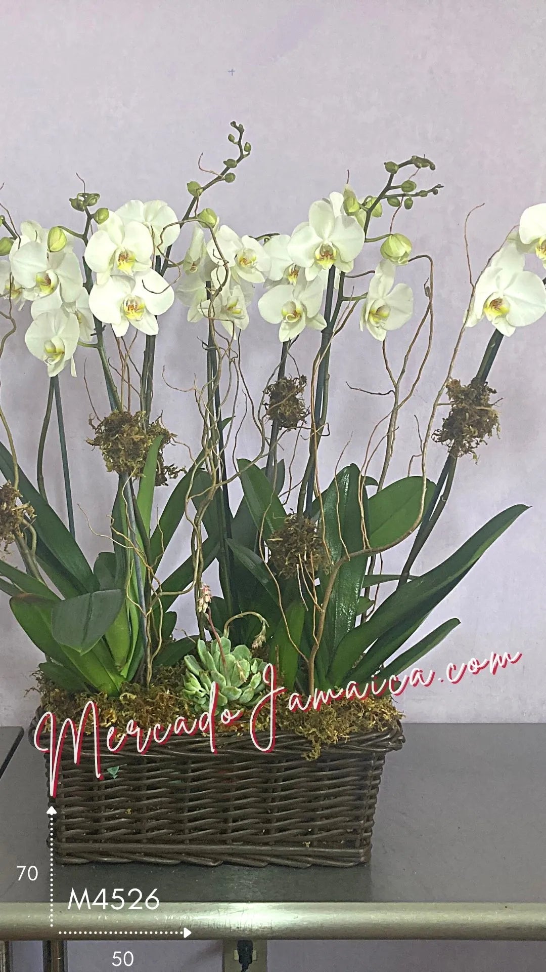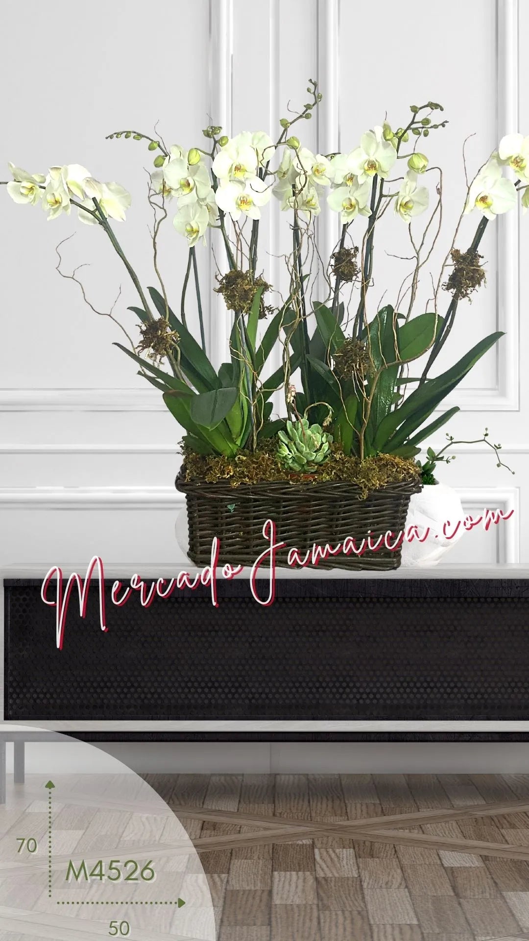 Este arreglo excepcional consta de 4 plantas de orquídeas phalaenopsis blancas, que simbolizan gracia, con un total de 8 tallos, lo que aporta elegancia a la composición. Se complementa con una planta suculenta, incluye varas de curly para un toque decorativo y en una canasta de color café con espuma floral. El musgo de hilo, sisal y biruta completan la presentación, añadiendo textura y belleza.