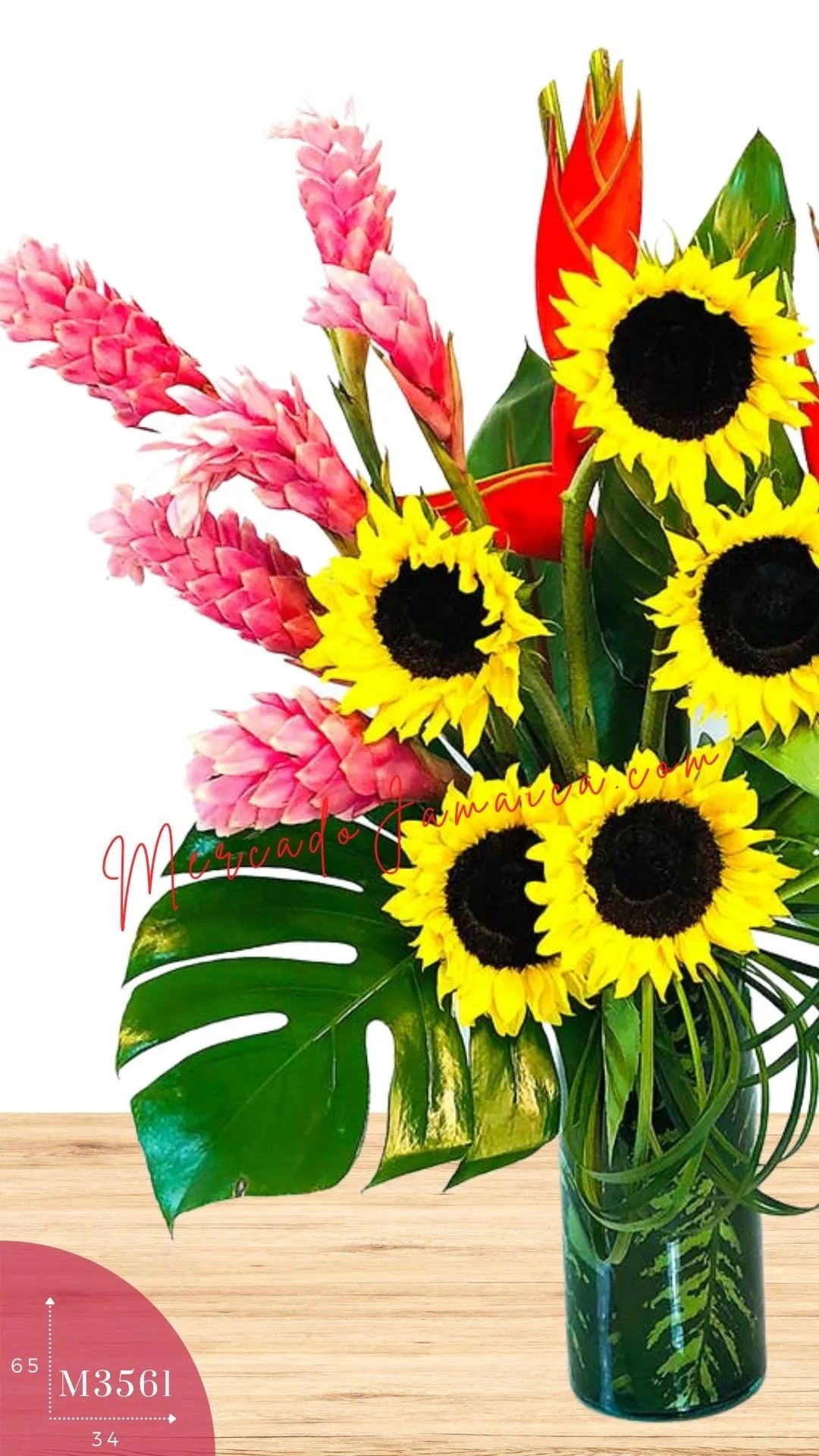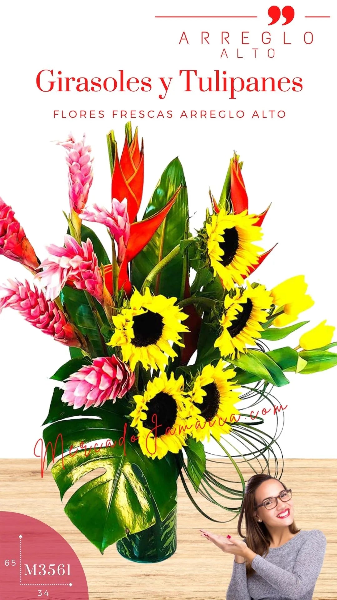 Inmersión: Sumérgete en un jardín de ensueño con este arreglo, donde girasoles y tulipanes se unen en un espectáculo de color y vida.Lista de ingredientes florales: