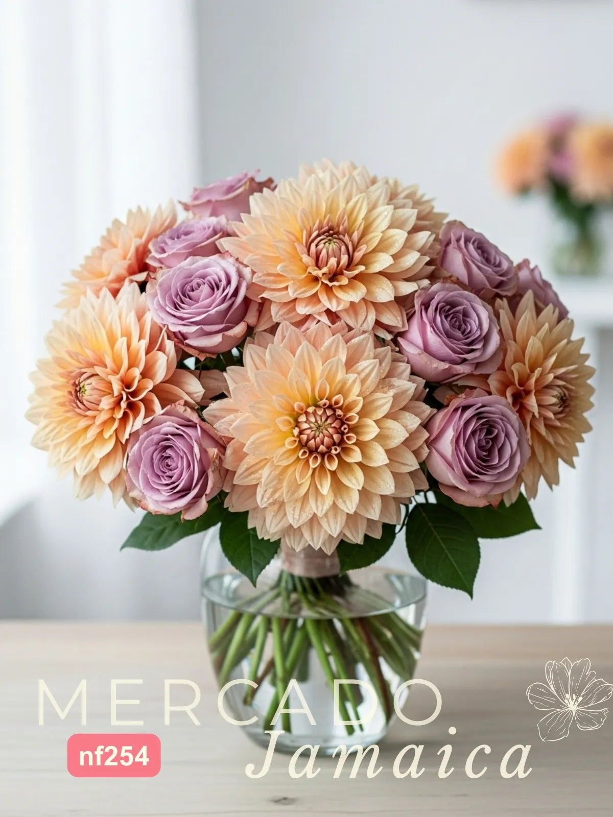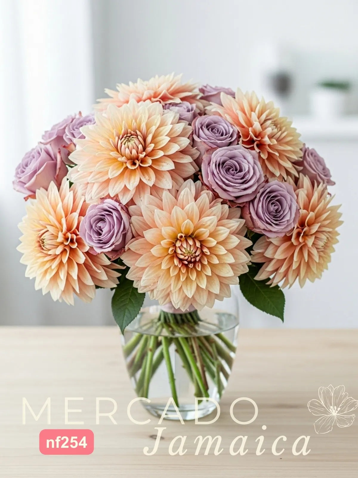Nuestros diseñadores disponen esta exquisita selección en un elegante jarrón de vidrio, permitiendo que la forma opulenta de cada dalia y la apertura perfecta de cada rosa sean las protagonistas. El follaje de ruscus se utiliza con maestría para dar estructura y un toque de verde profundo que enmarca la paleta de colores desaturados, creando una composición que se siente a la vez natural y perfectamente curada.