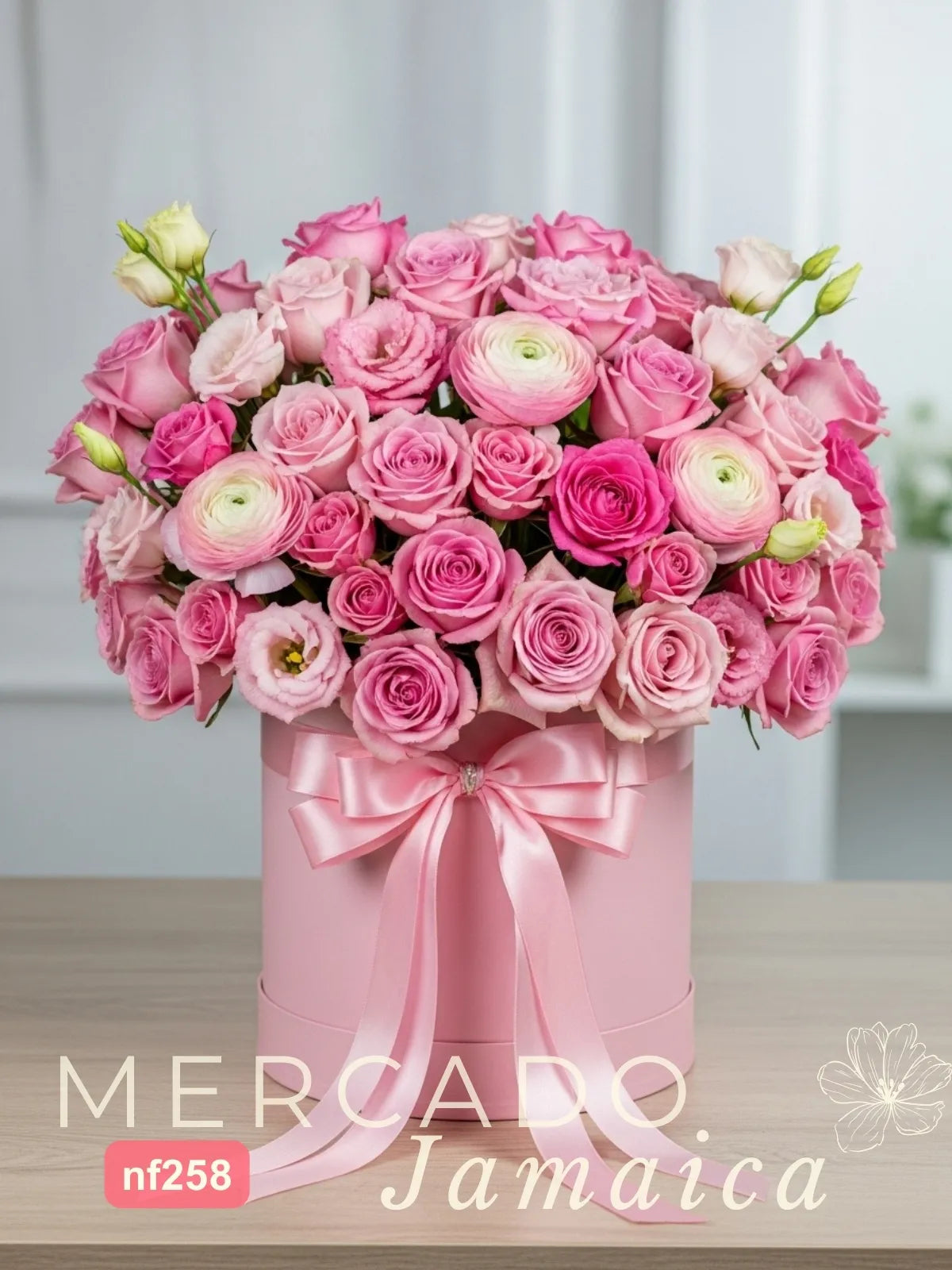 El corazón de esta composición es una celebración de la rosa en toda su diversidad. Veinticuatro rosas de un exquisito color rosa, seleccionadas por su impecable apertura, crean una base de romance clásico. A su alrededor, un generoso bounche de mini rosas del mismo tono añade una textura delicada y un volumen que enriquece el conjunto. Para un toque de diseño y una sofisticación inigualable, diez ranúnculos de un elegante color amarillo mantequilla se entrelazan en la composición, aportando puntos de luz y la belleza de sus infinitas capas de pétalos. Finalmente, un bounche de lisianthus rosa, con su textura sedosa, completa esta sinfonía de flores.