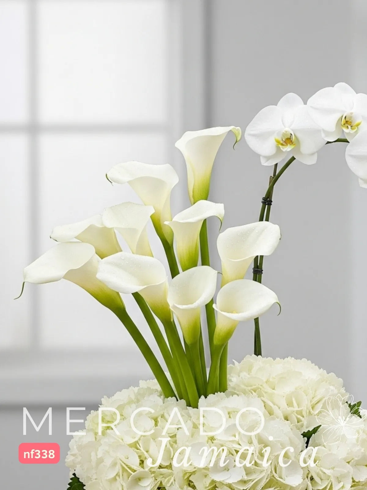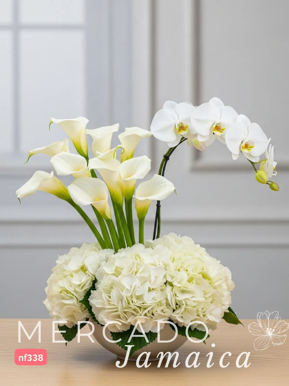 Un arreglo floral que evoca lujo y sofisticación con una combinación exquisita de texturas y formas en blanco. La elegancia de las hortensias se fusiona con la delicada belleza de las orquídeas phalaenopsis blancas y la majestuosidad de diez callas blancas. Presentado en un florero de cerámica tipo bowl con malla metálica, este diseño es perfecto para celebrar una ocasión especial con un estilo inolvidable.