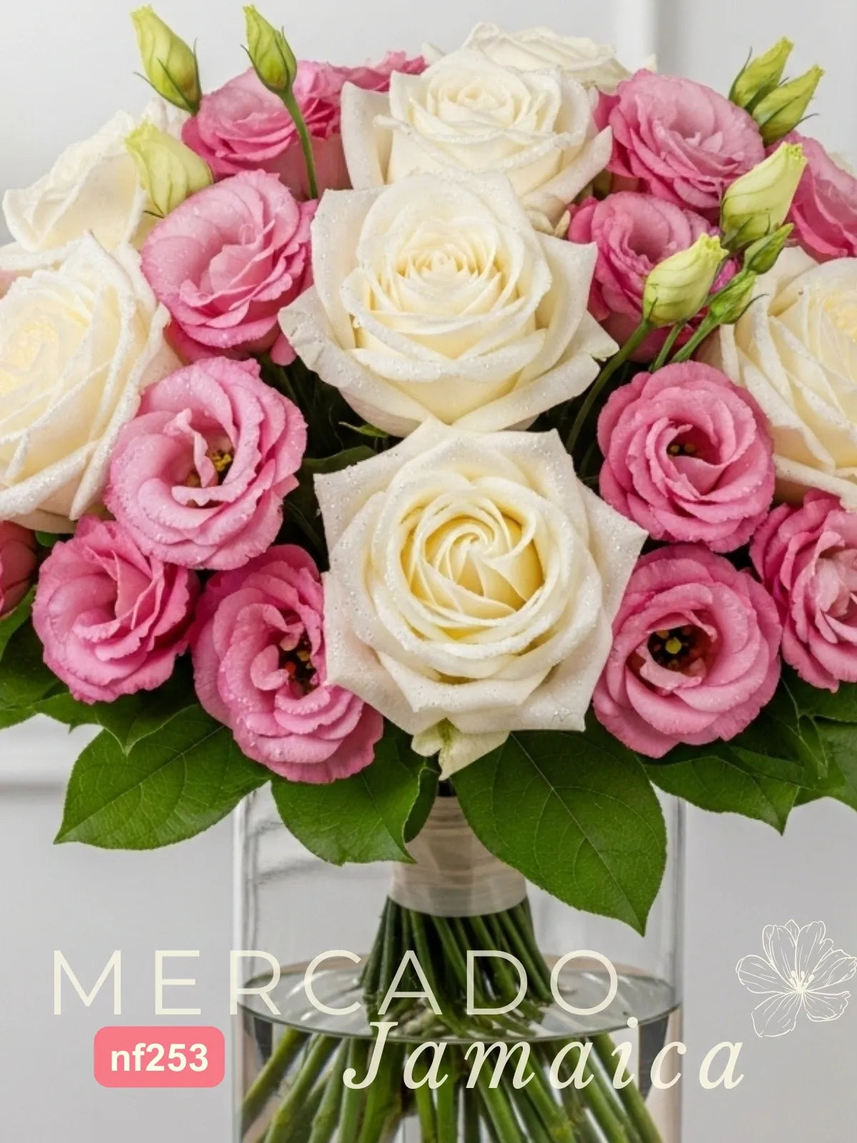 Quince rosas blancas de variedades premium, como 'Mondial' o 'Playa Blanca', forman la base de este diseño. Seleccionadas por su espectacular apertura y su blanco puro, simbolizan la sinceridad y la lealtad. Entrelazado con ellas, un generoso bounche de lisianthus rosa, una flor de gran elegancia con múltiples pétalos, añade un toque de color y una textura suave y abundante.