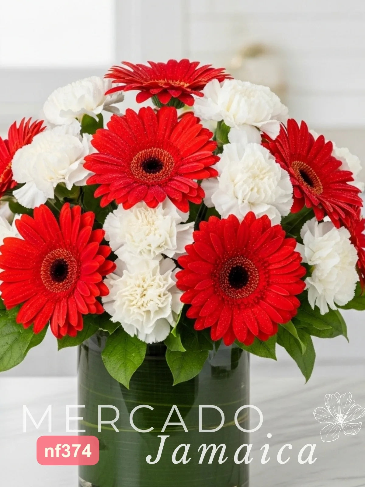 La gerbera es conocida por simbolizar la alegría, el optimismo y la pureza. El clavel es una flor con una larga historia de simbolismo; los claveles blancos representan el amor puro y la buena suerte, mientras que los rojos simbolizan el amor y la pasión profunda. Esta combinación de flores es ideal para demostrar un sentimiento sincero y genuino, perfecto para un cumpleaños, un aniversario, o simplemente para alegrar el día a alguien especial.