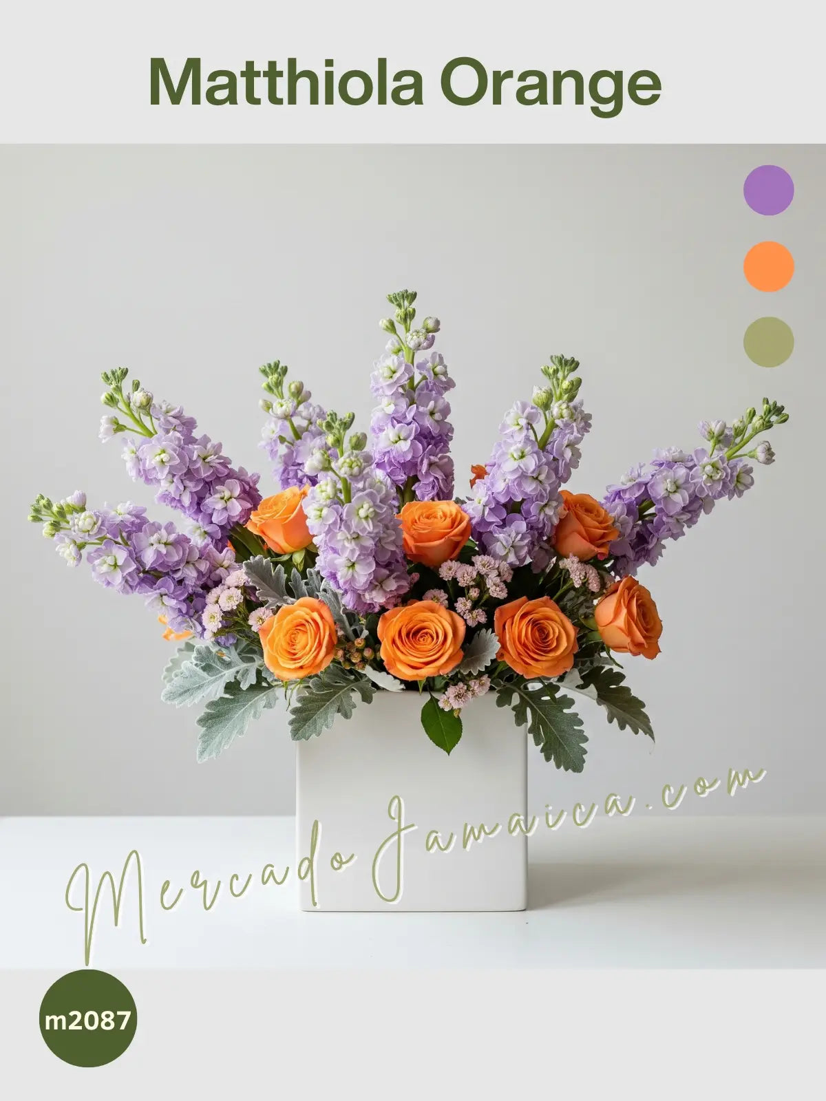 El Arreglo "Matthiola Orange" es una sinfonía de formas, colores y fragancias. La armonía entre el aroma dulce de las Matthiolas y el frescor vibrante de las rosas crea una atmósfera envolvente. La audaz combinación de lavanda y naranja no solo es visualmente impactante, sino que también transmite una sensación de alegría, creatividad y equilibrio.