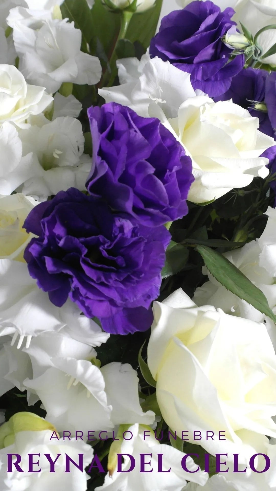 Gladiolas blancas, lisianthus morado, rosas blancas, arreglo fúnebre.