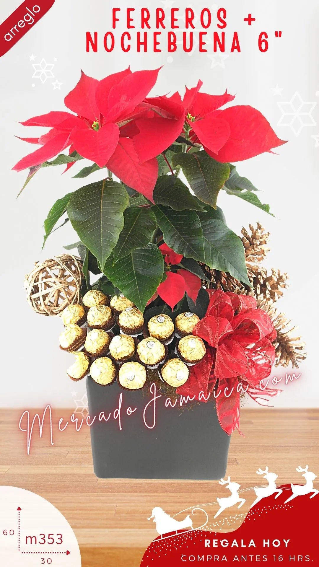Este arreglo cuenta con una planta Nochebuena de exuberantes hojas rojas, símbolo de la estación, complementada con adornos dorados que evocan el brillo de las luces navideñas. Incluye rosetas de chocolate gourmet para deleitar tus sentidos y una decoración con un moño rojo que añade un toque de calidez festiva. Todo presentado en una base sólida y elegante que resalta la belleza natural de la planta.