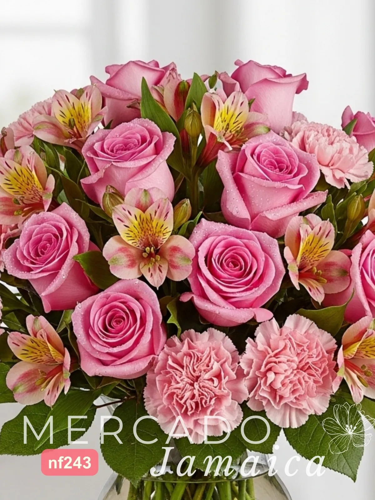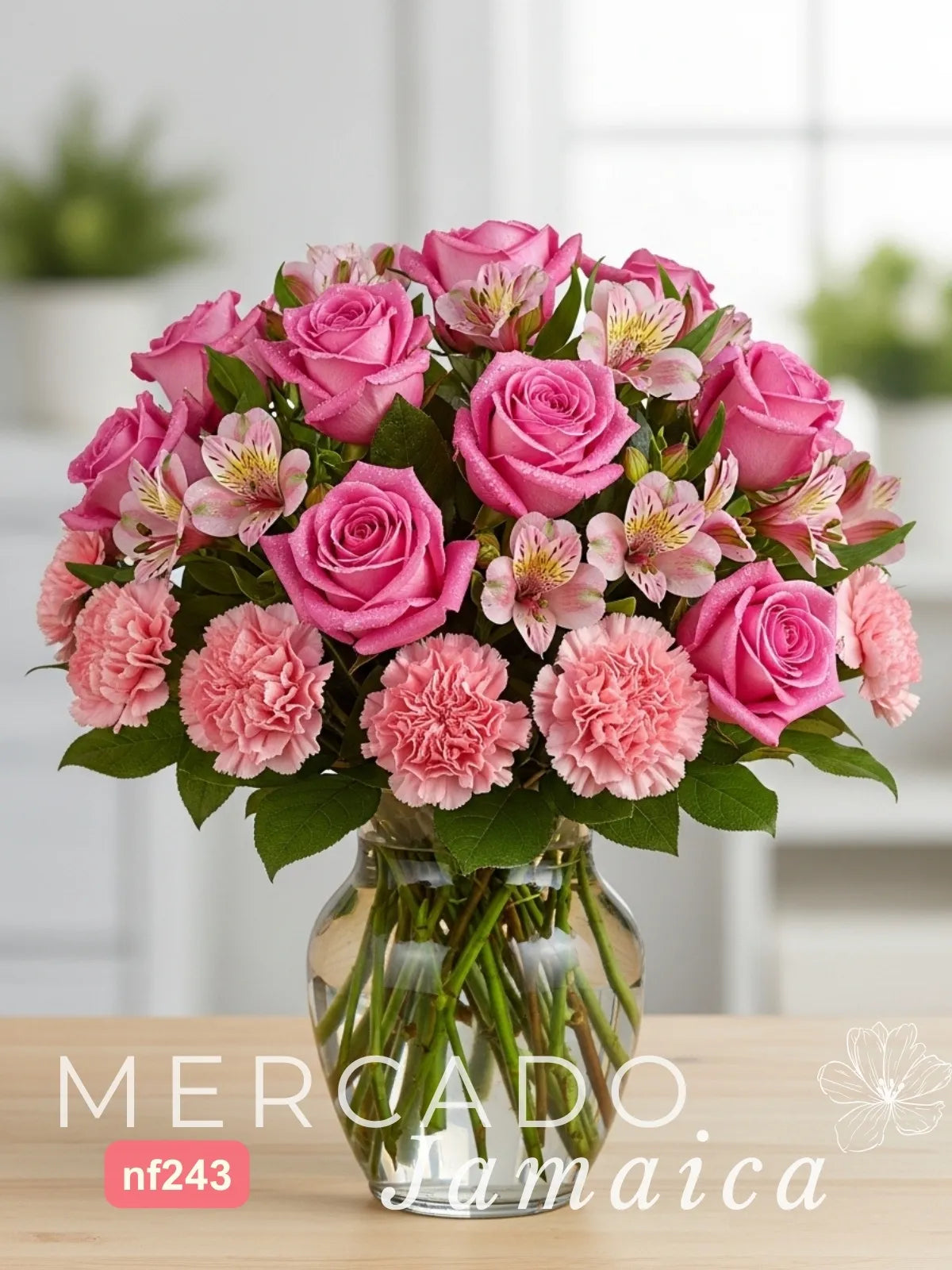 Este arreglo es una verdadera sinfonía en tonos rosas, una composición abundante y clásica que celebra la belleza de las flores más queridas en una armonía de texturas y matices.
