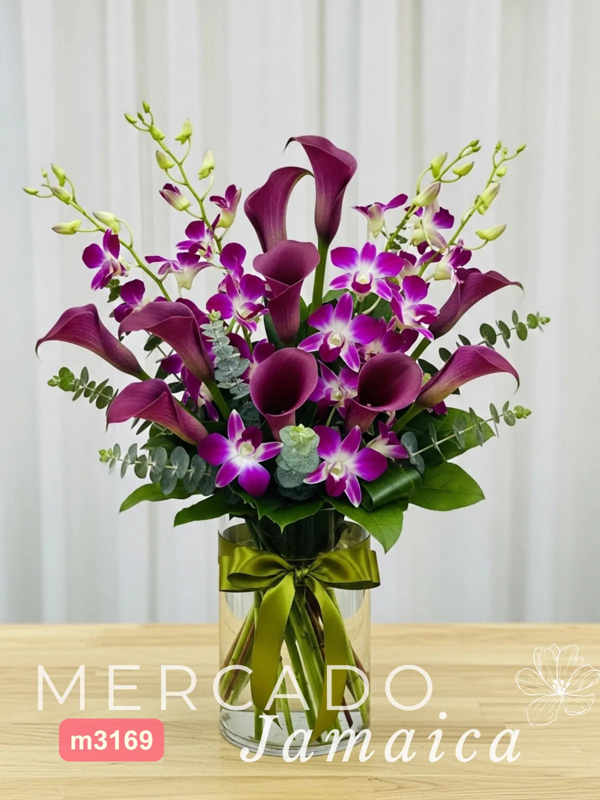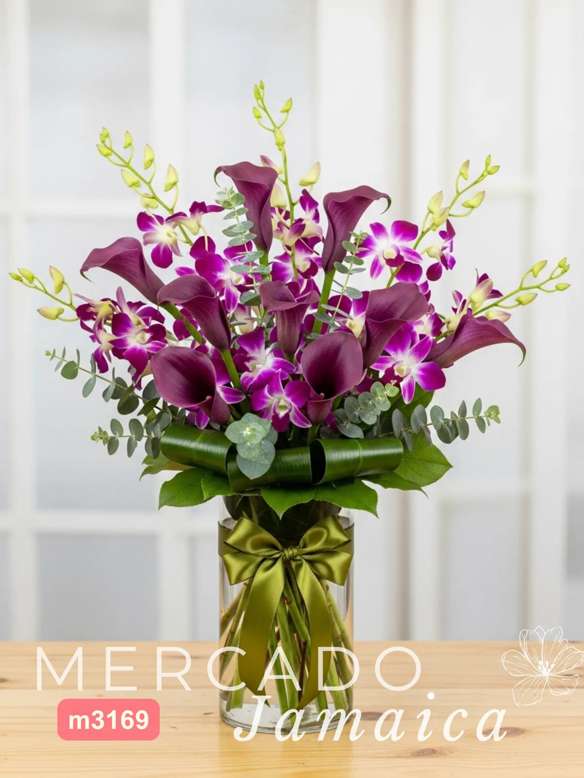 El bouquet Callas Moradas & Orquídeas Lila incluye 10 flores callas de color morado y 10 orquídeas dendrobium de color lila presentadas en un florero de cristal importado. También se suministra con un moño de listón satinado y papel de traslado.