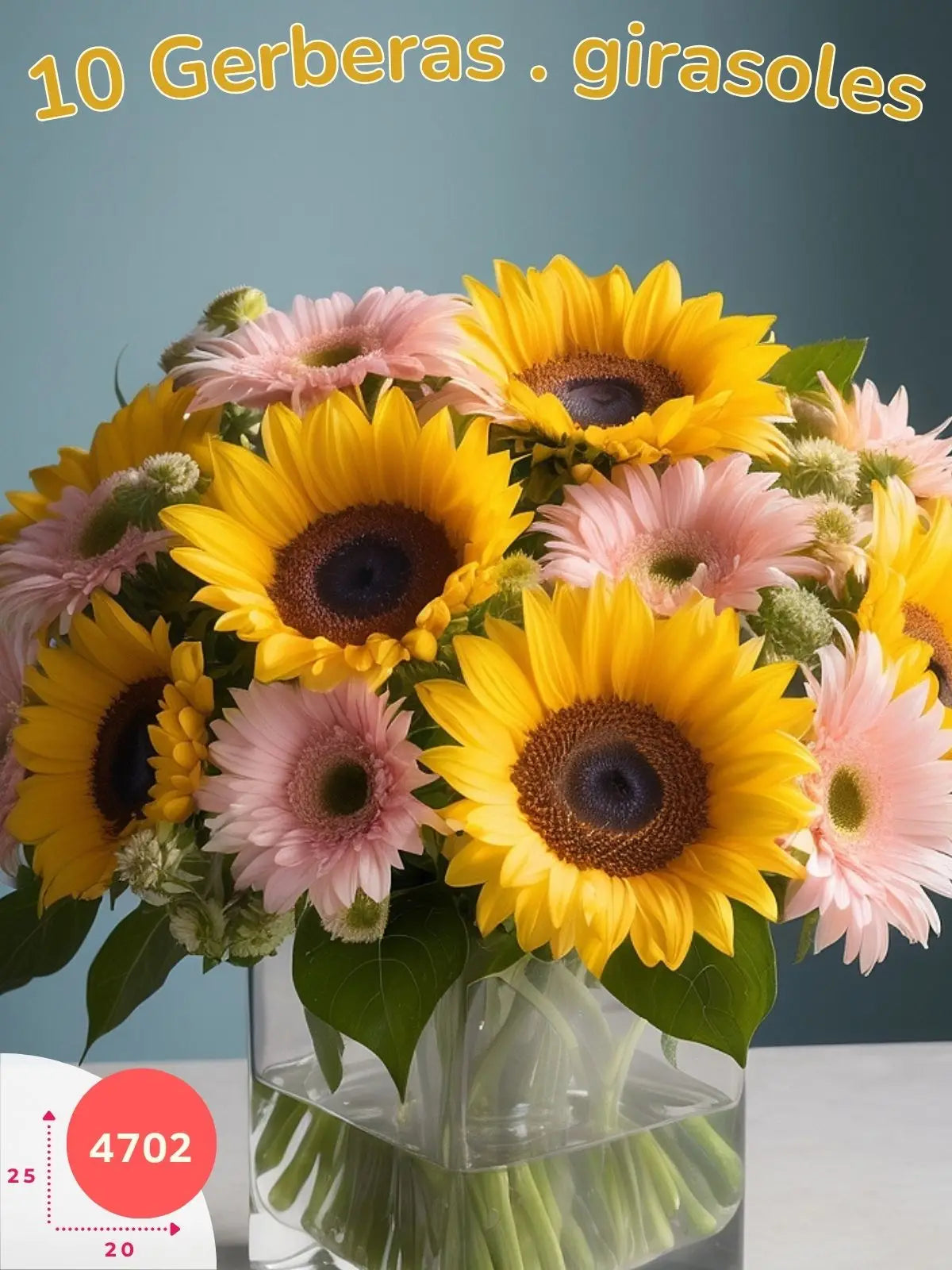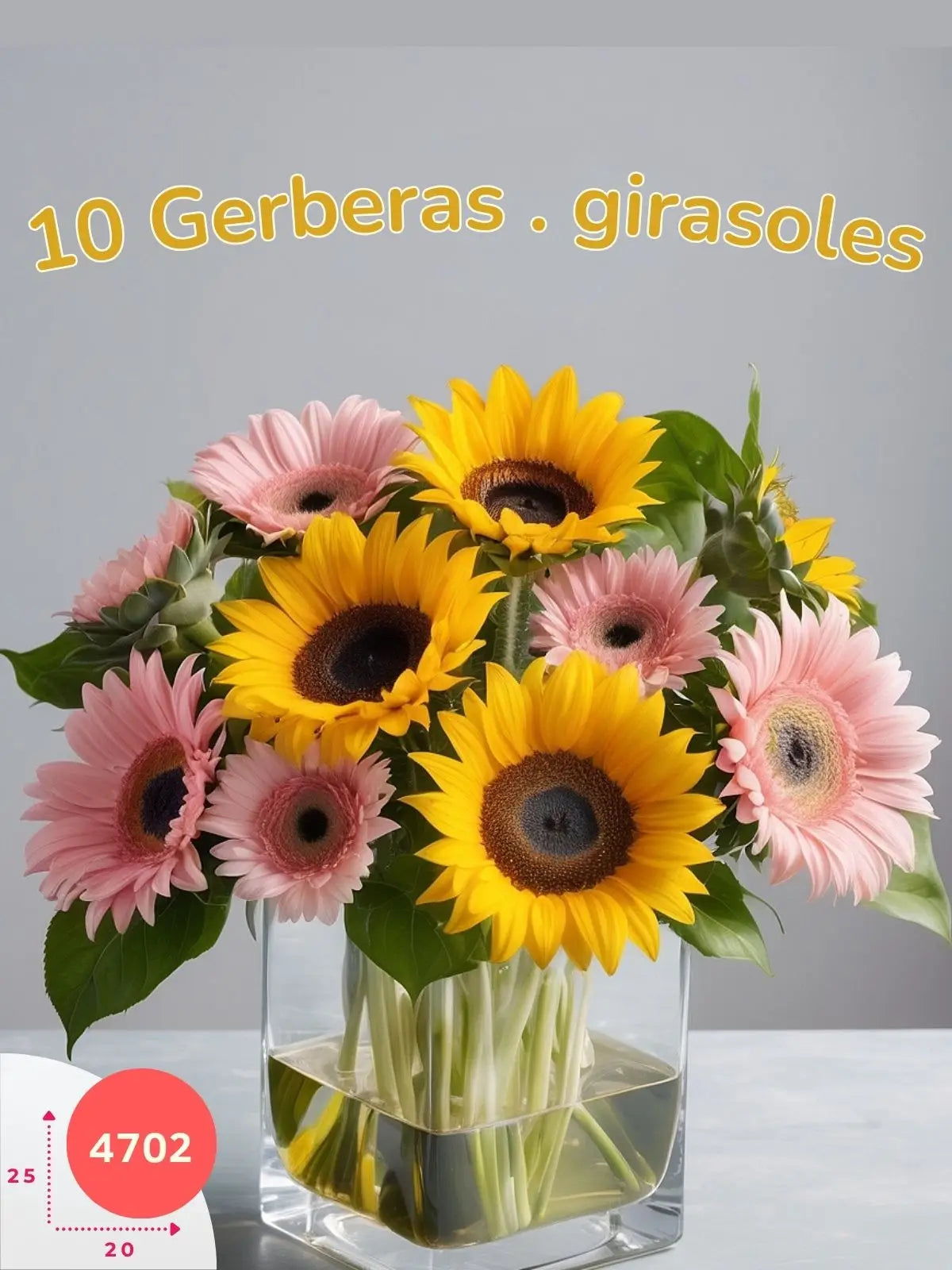 Este centro de mesa hecho a mano ilumina tus eventos con luz, energía y alegría. Las 10 gerberas color rosa y los 5 girasoles son una combinación perfecta que representa amor y felicidad en cada uno de tus eventos. Colócalo en el centro de la mesa, agrega vitalidad y armonía, fácil y rápidamente.