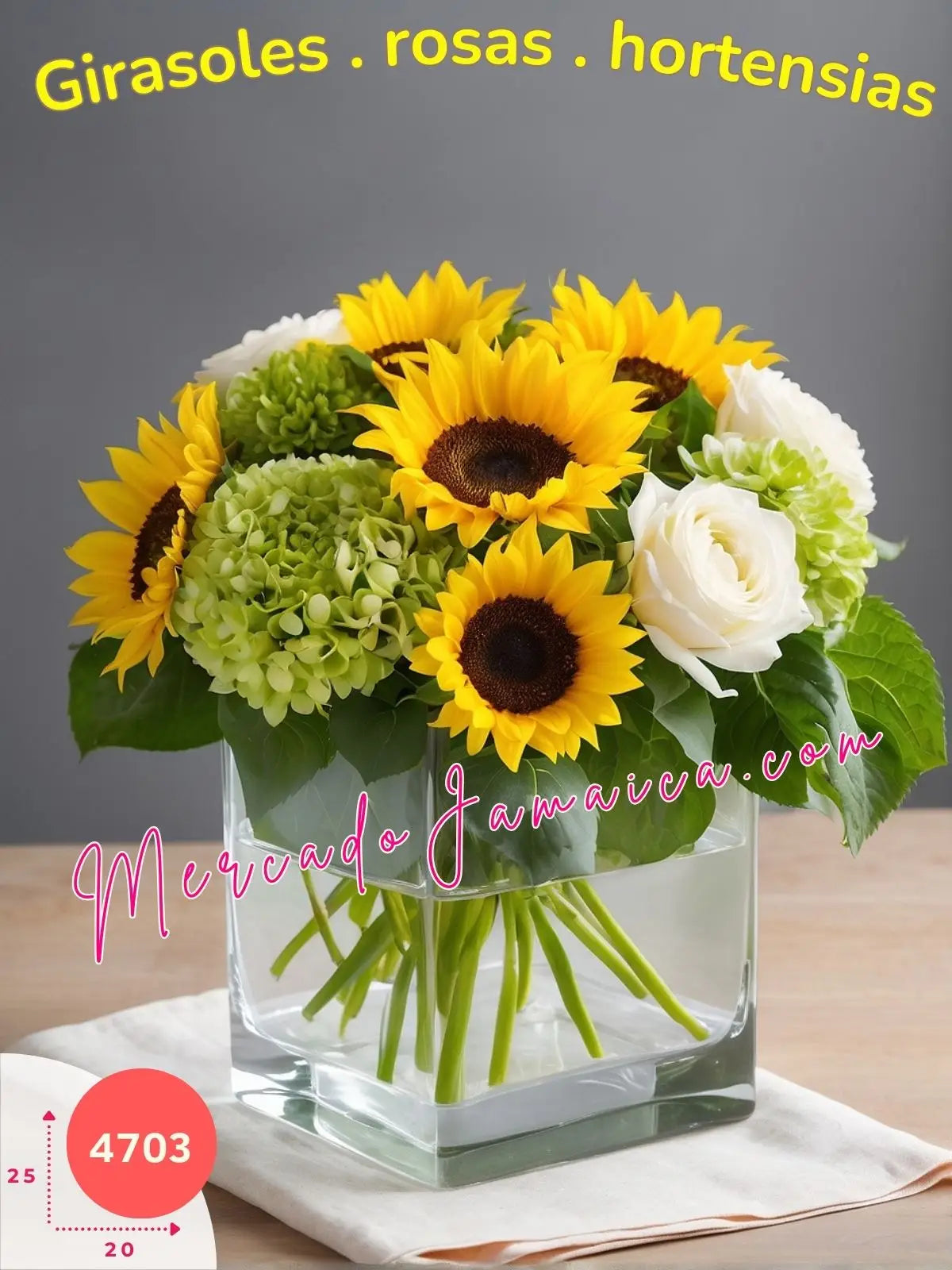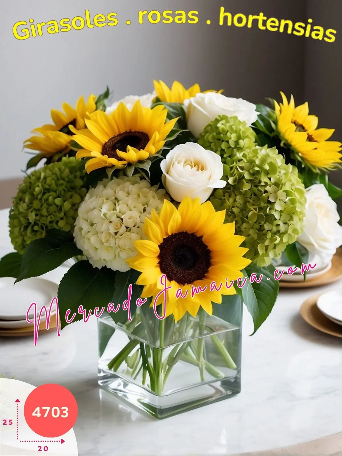 Centro de Mesa Primaveral con Girasoles, Rosas Blancas y Hortensias Verdes Agrega elegancia, frescura y vitalidad a tus celebraciones con este hermoso centro de mesa...