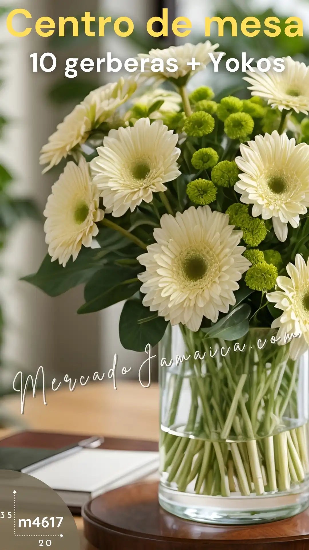 La Colección Floral con Gerberas te ofrece 10 Gerberas blanco junto con flores Yokos verdes, todo presentado en un florero tipo cilindro mediano de 4x6 pulgadas. Un toque de elegancia y frescura para tu mesa.