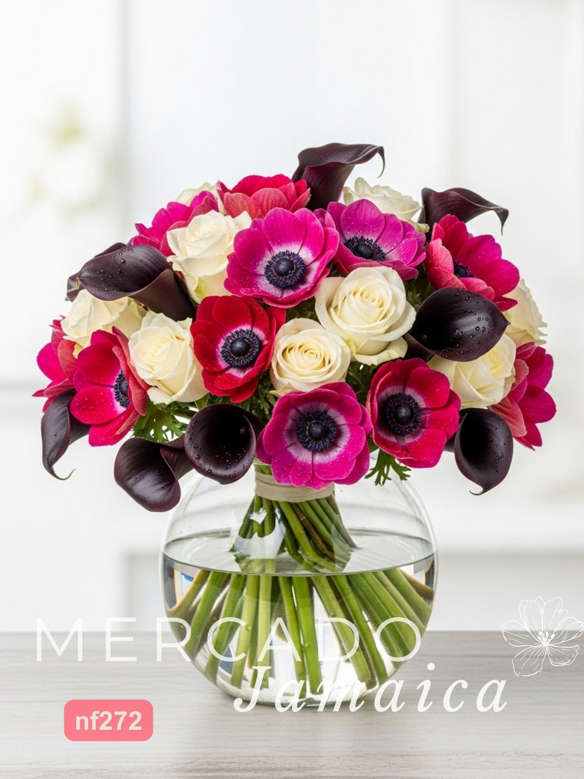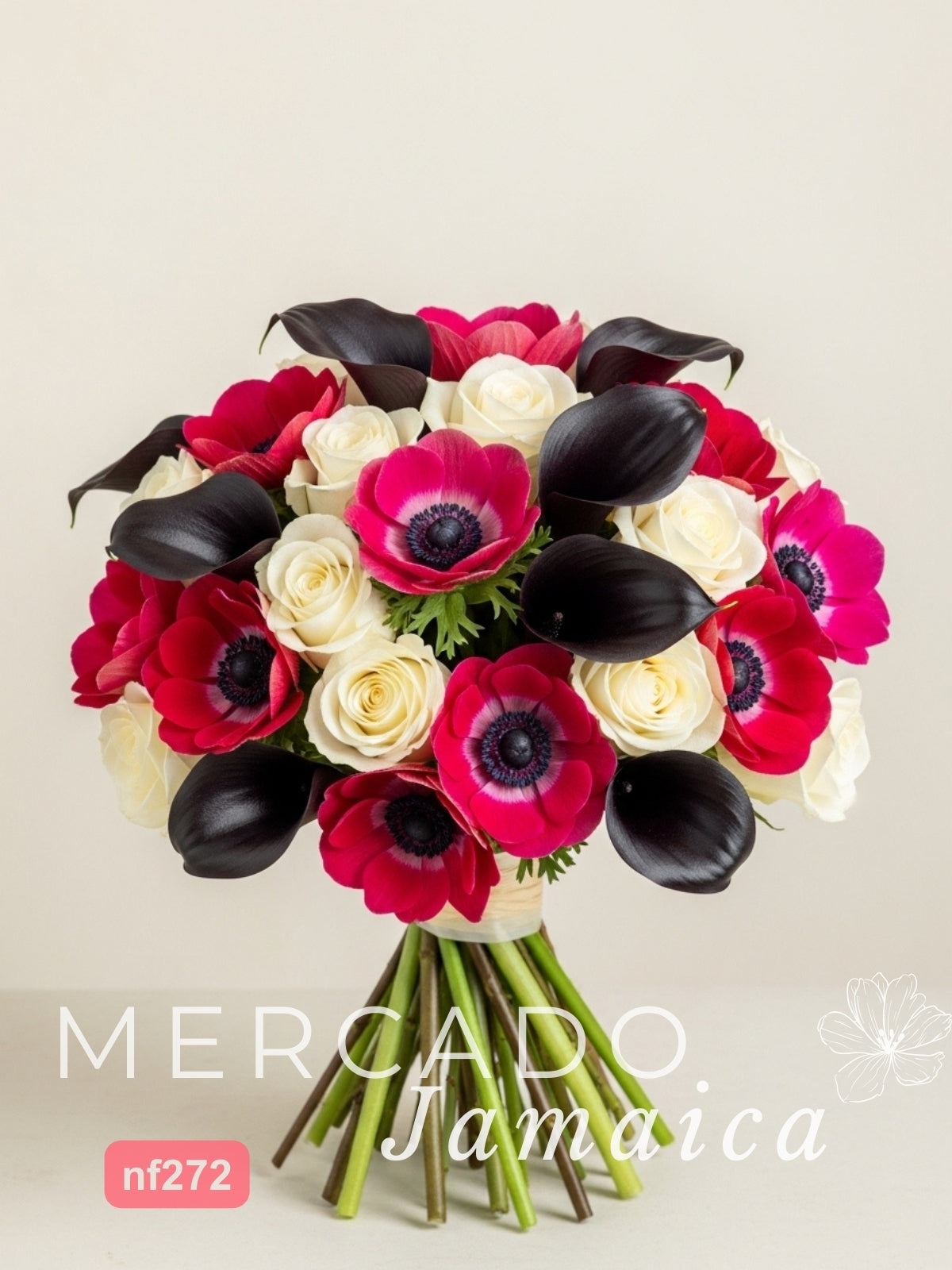 Un diseño para quienes no temen destacar. 10 enigmáticas calas negras son el centro de este arreglo de alto impacto, donde el contraste puro de 24 rosas blancas se enciende con el estallido de color de 10 anémonas fucsia. Una pieza de arte floral, moderna y audaz.
