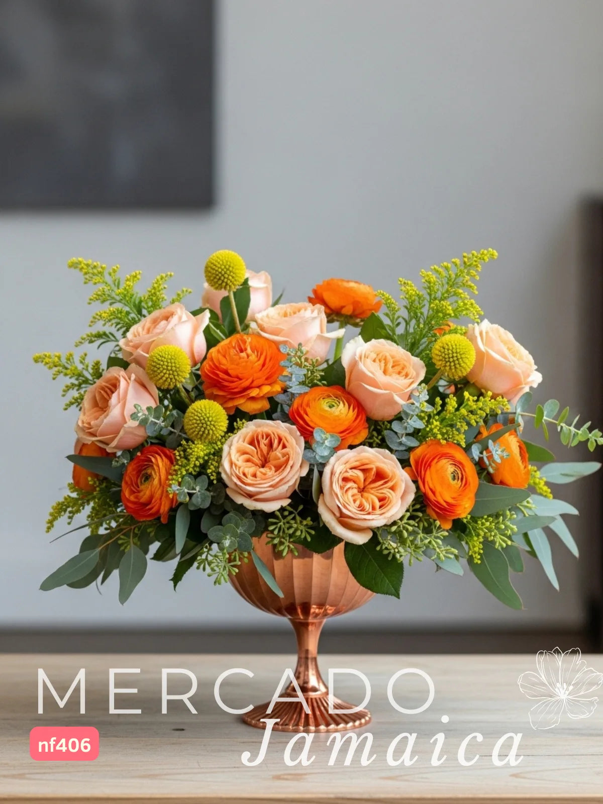 Un arreglo floral que evoca la dulzura y la alegría con una combinación de tonalidades vibrantes y suaves. Diez rosas inglesas en tonos rosa o durazno simbolizan el encanto y la gratitud, mientras que diez craspedias amarillas y diez ranúnculos naranja añaden un toque de luz y elegancia. El diseño se complementa con tallos de eucalipto semillado y mini dólar, que aportan un toque rústico y una textura única. Todo el conjunto se presenta en una copa plástica adornada con una malla metálica, ideal para un regalo inolvidable.