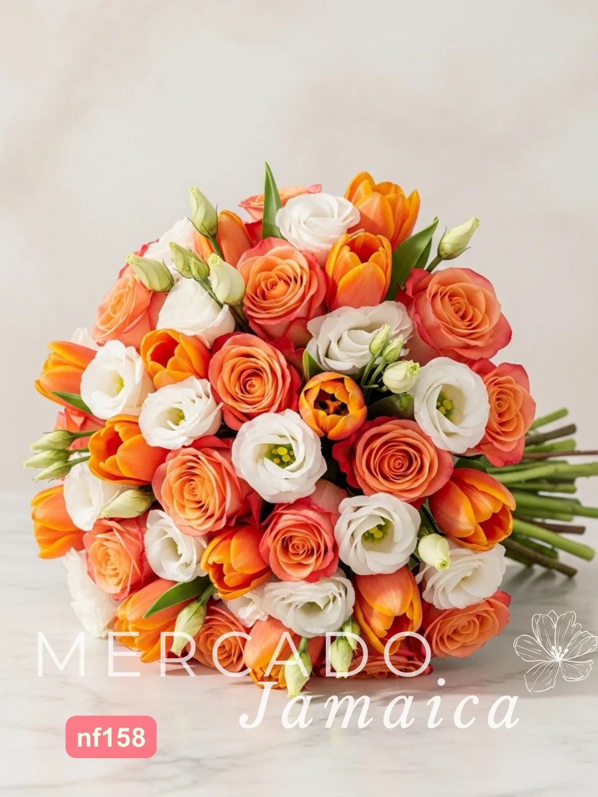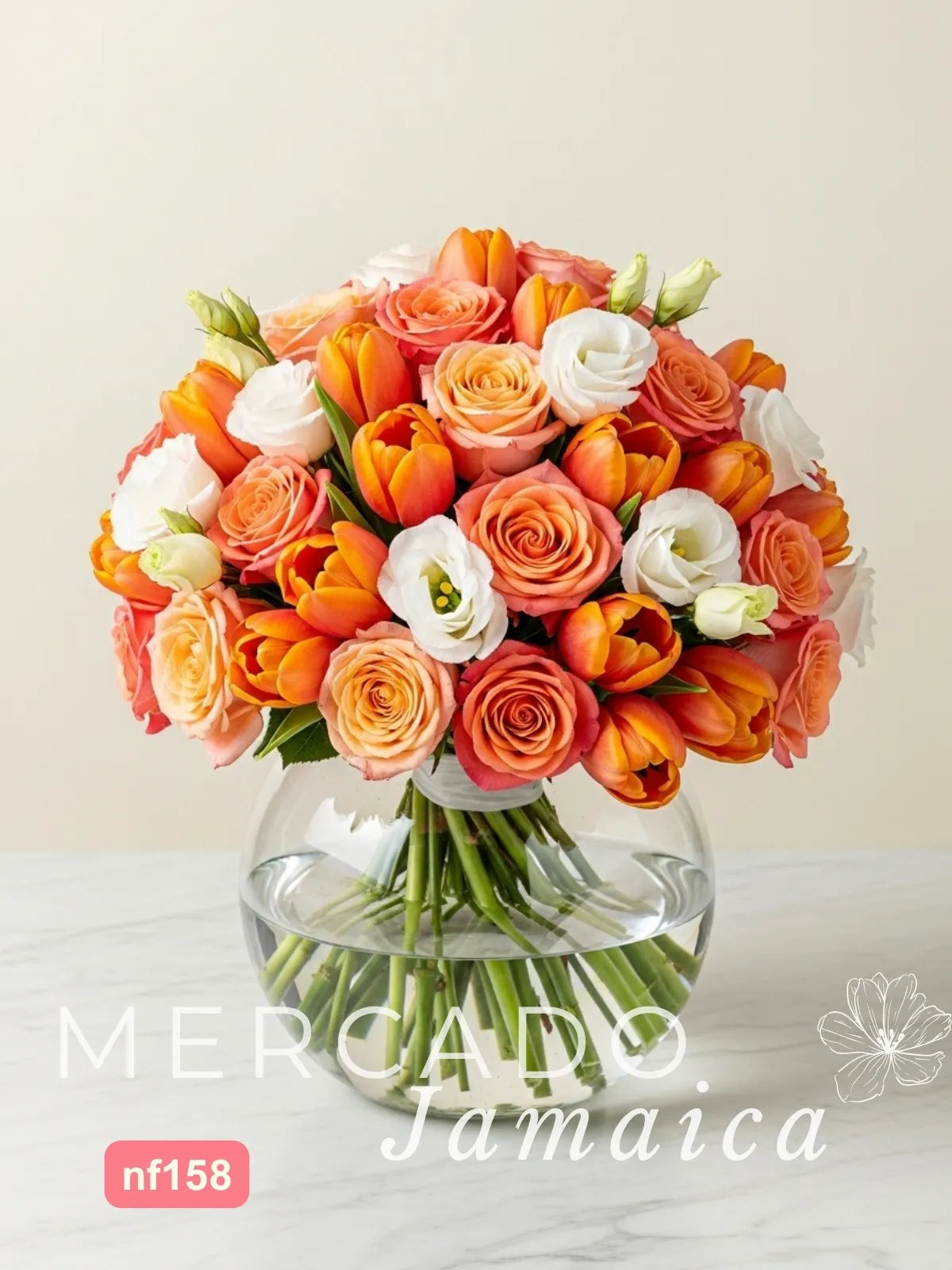Una inyección de pura energía y optimismo. 24 intensas rosas y 20 tulipanes en tonos naranja vibrante se combinan con la elegancia del lisianthus blanco, creando un contraste espectacular. Presentado en un florero esférico de vidrio, es el regalo perfecto para celebrar un éxito o levantar el ánimo con estilo.
