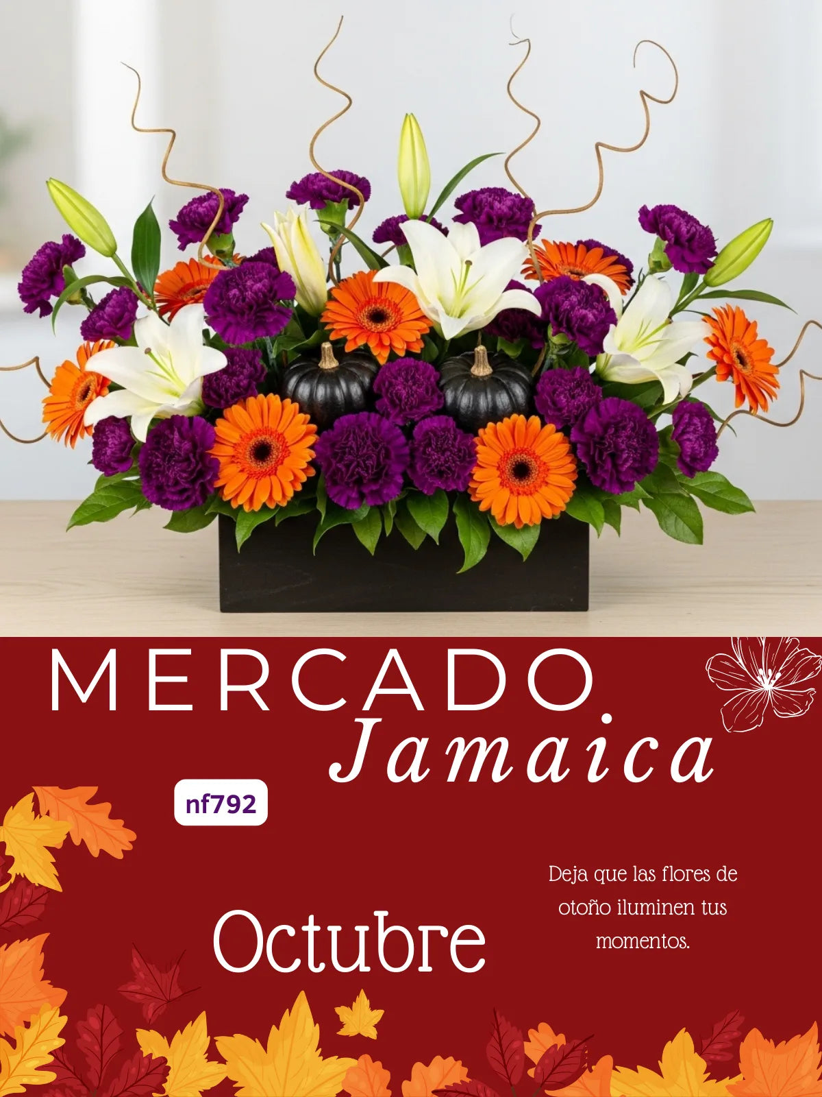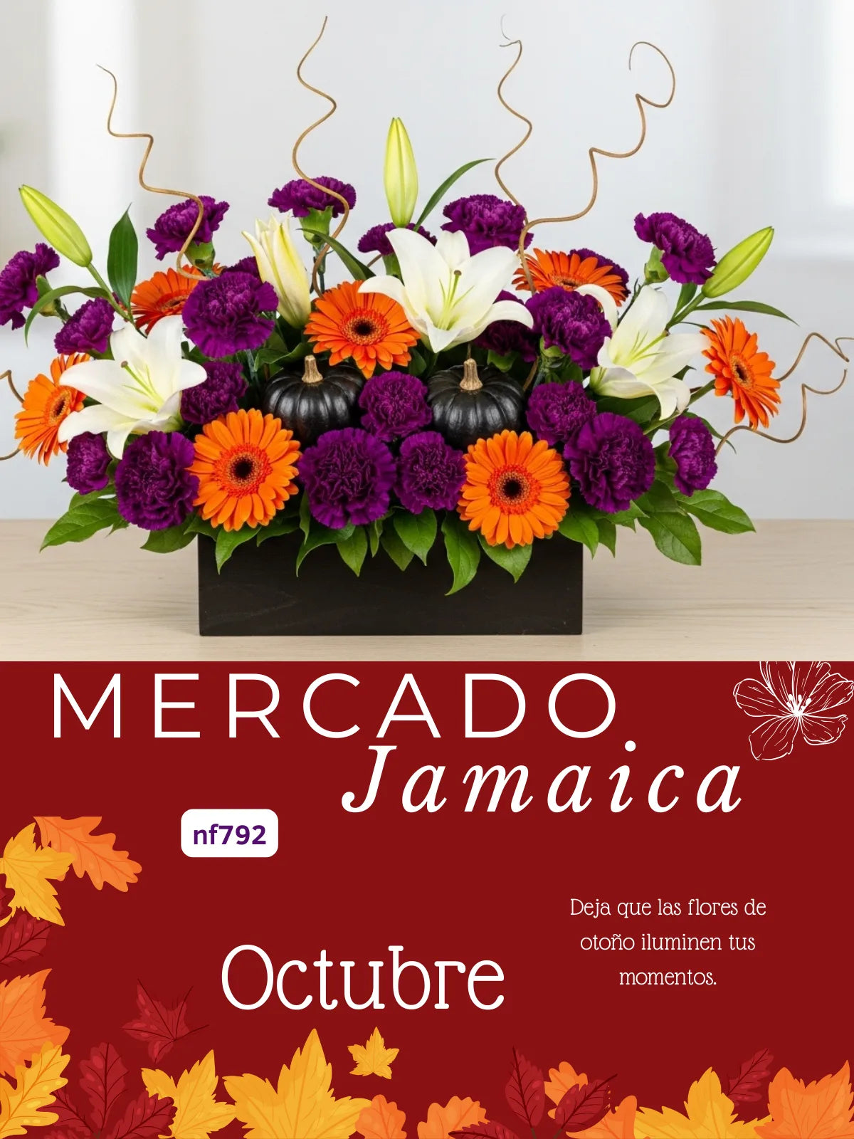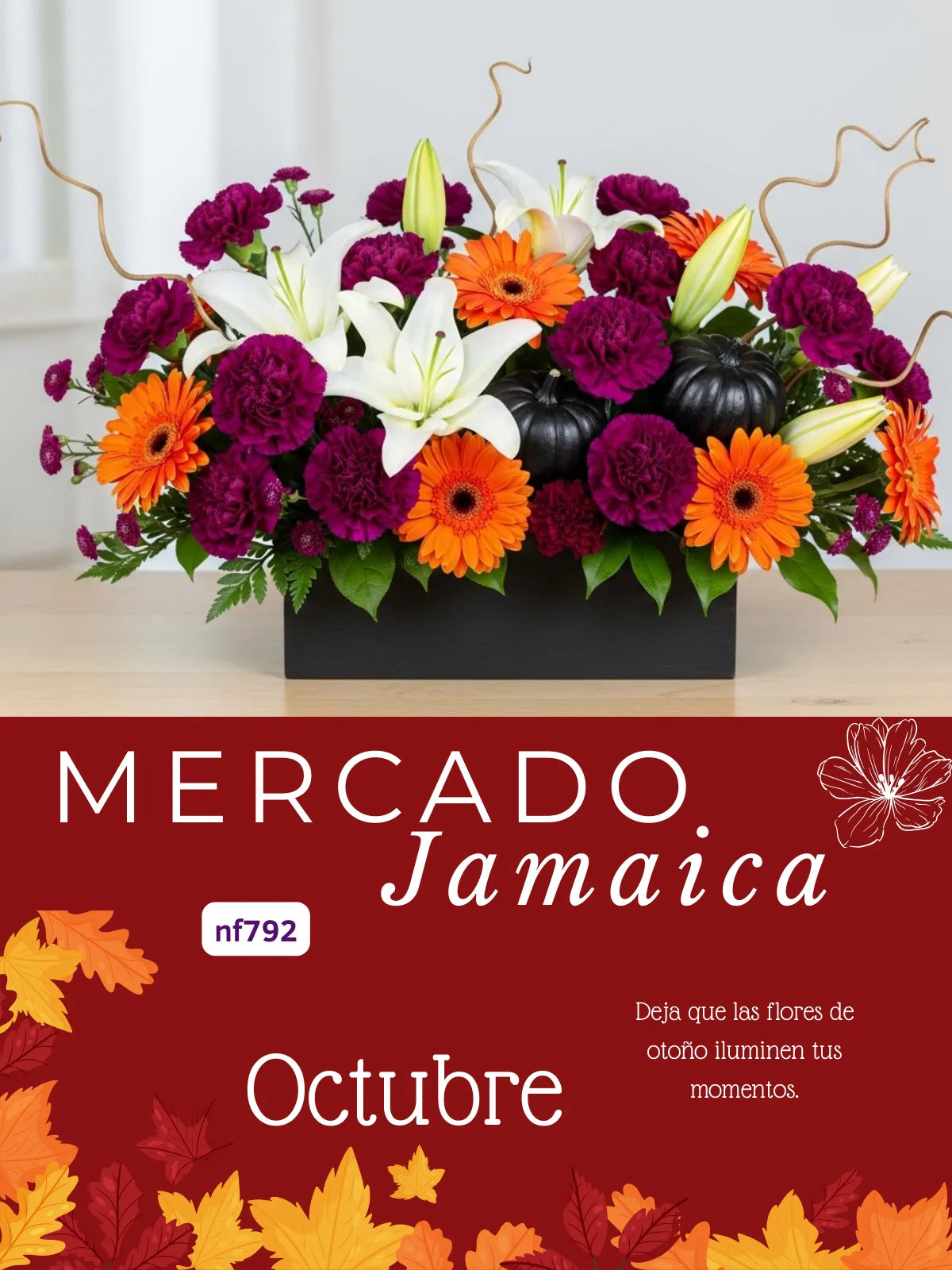 Cuando el sol se esconde temprano, las calabacitas bruja prenden sus linternas de color. Se rodean de flores ocres y celebran la llegada del otoño. Cada arreglo es una invitación a esa fiesta escondida entre sombras.