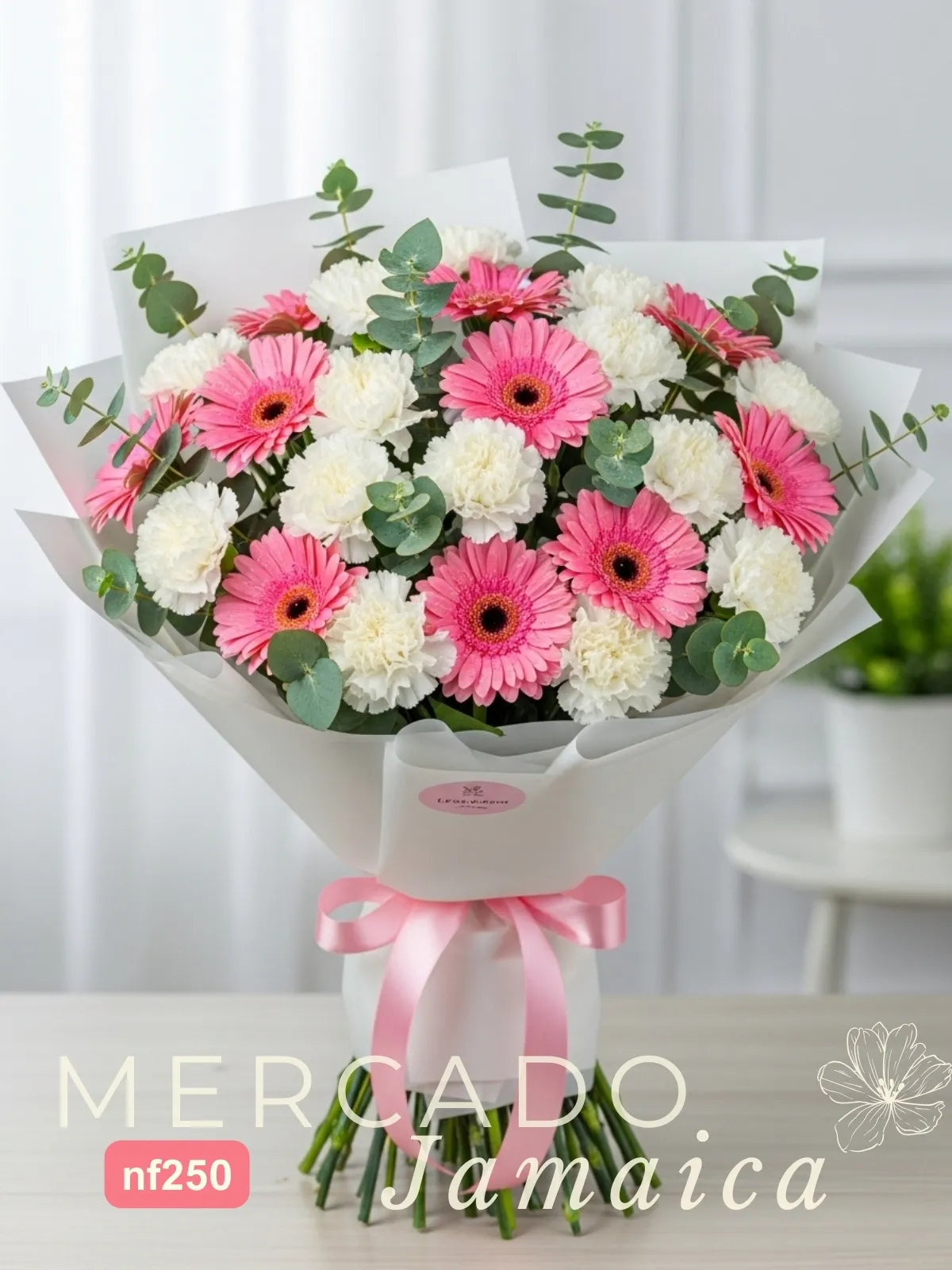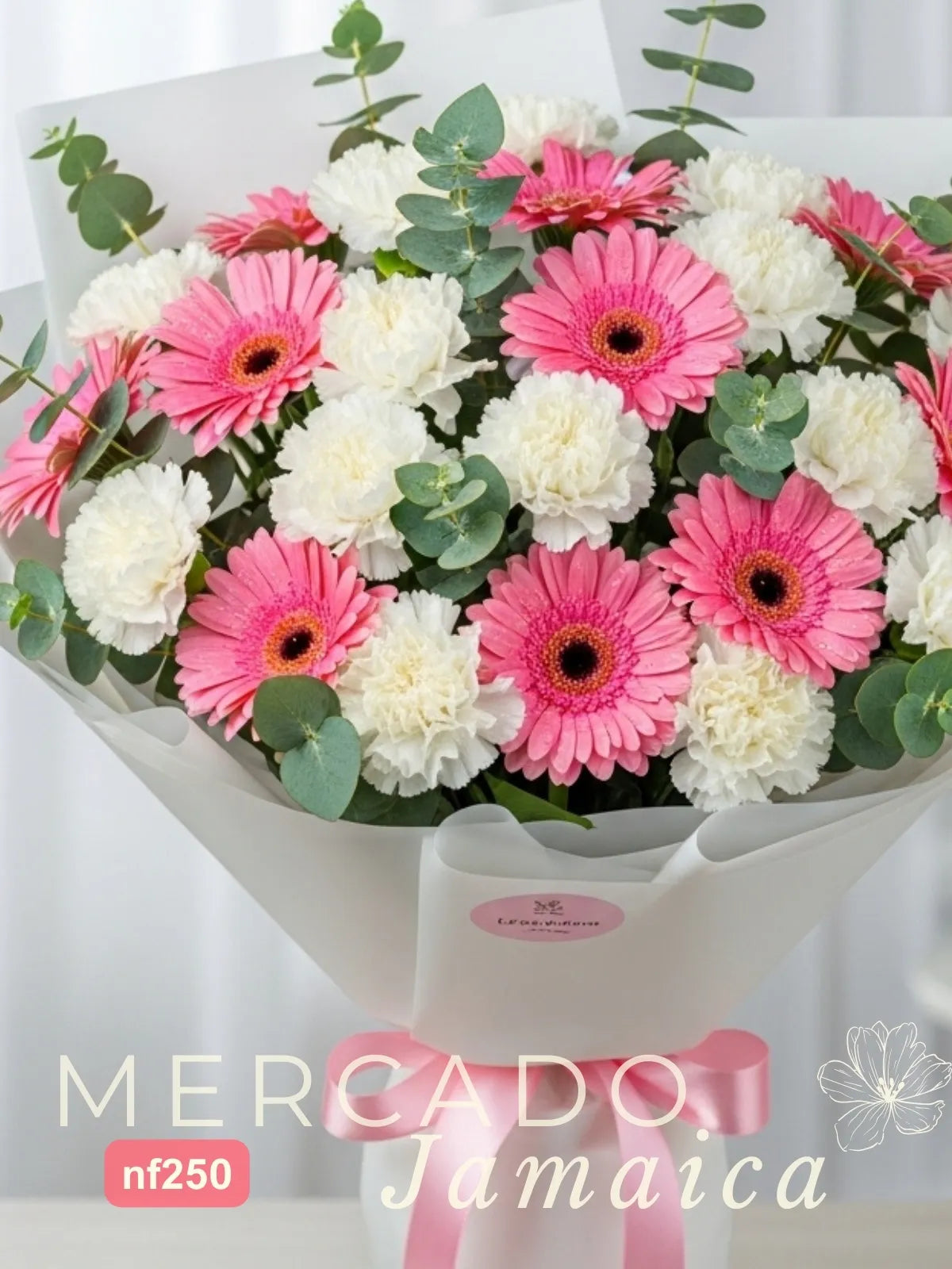 Diez gerberas de un encantador color rosa son el alma de este arreglo. Su forma abierta y feliz es un símbolo universal de buenos deseos y alegría. Para crear un contraste de texturas y una base de pureza, se entrelazan diez claveles blancos, que con su forma esponjosa añaden volumen y suavidad.