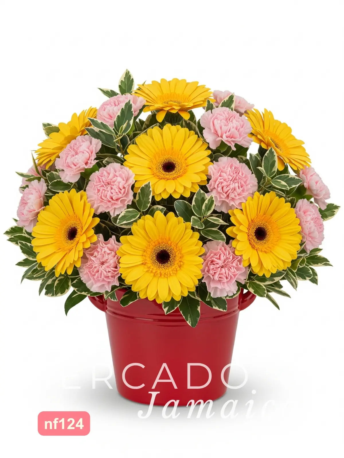 Diseñado para quienes aprecian los detalles, este arreglo fusiona la suavidad de las rosas claras con el optimismo de las gerberas amarillas. El florero rosa cilíndrico realza la feminidad del conjunto, mientras el follaje dólar mantiene un aire natural. Ideal para: