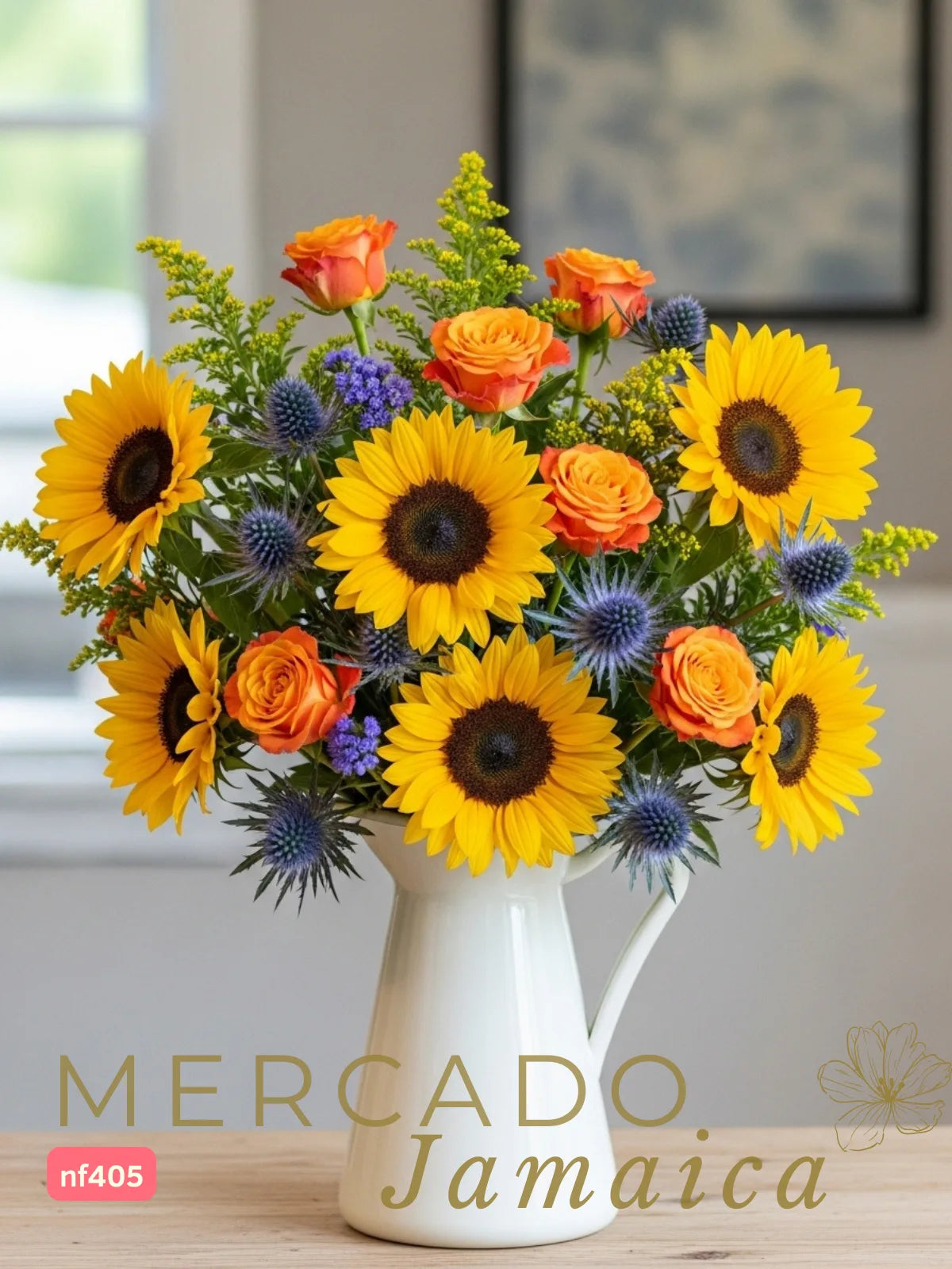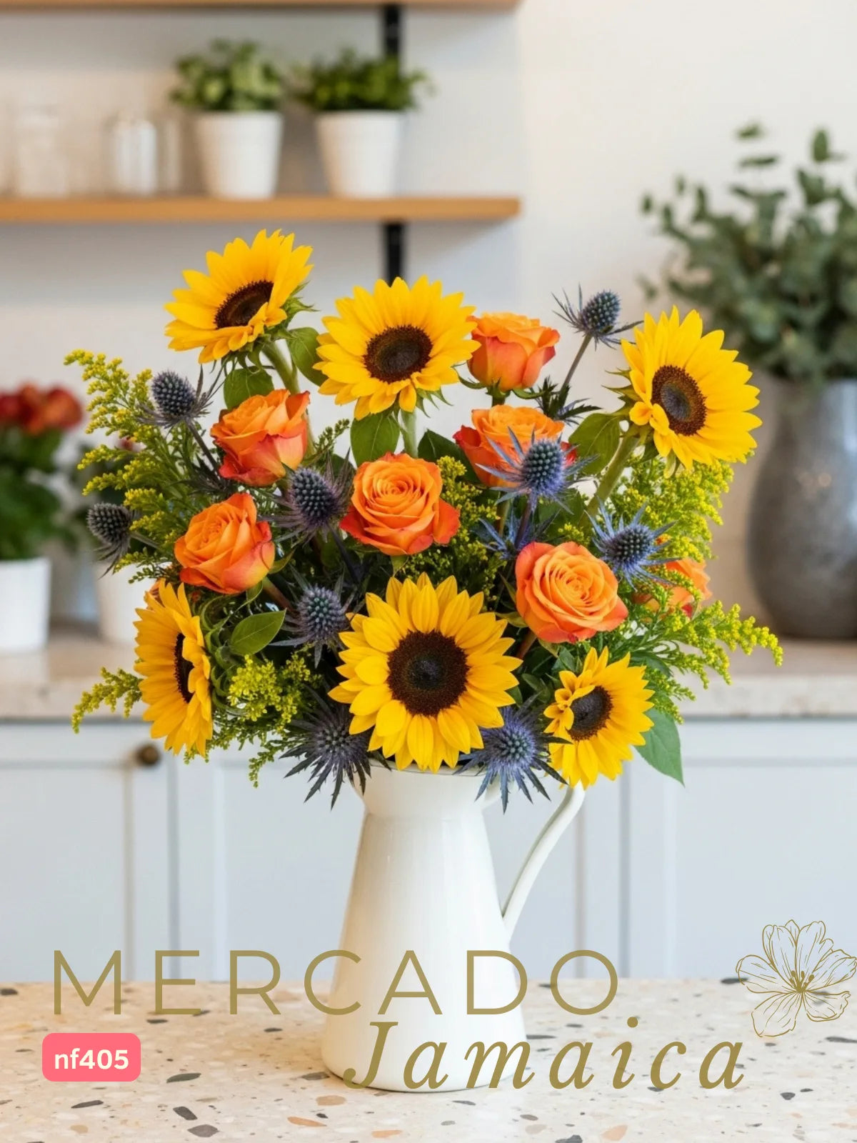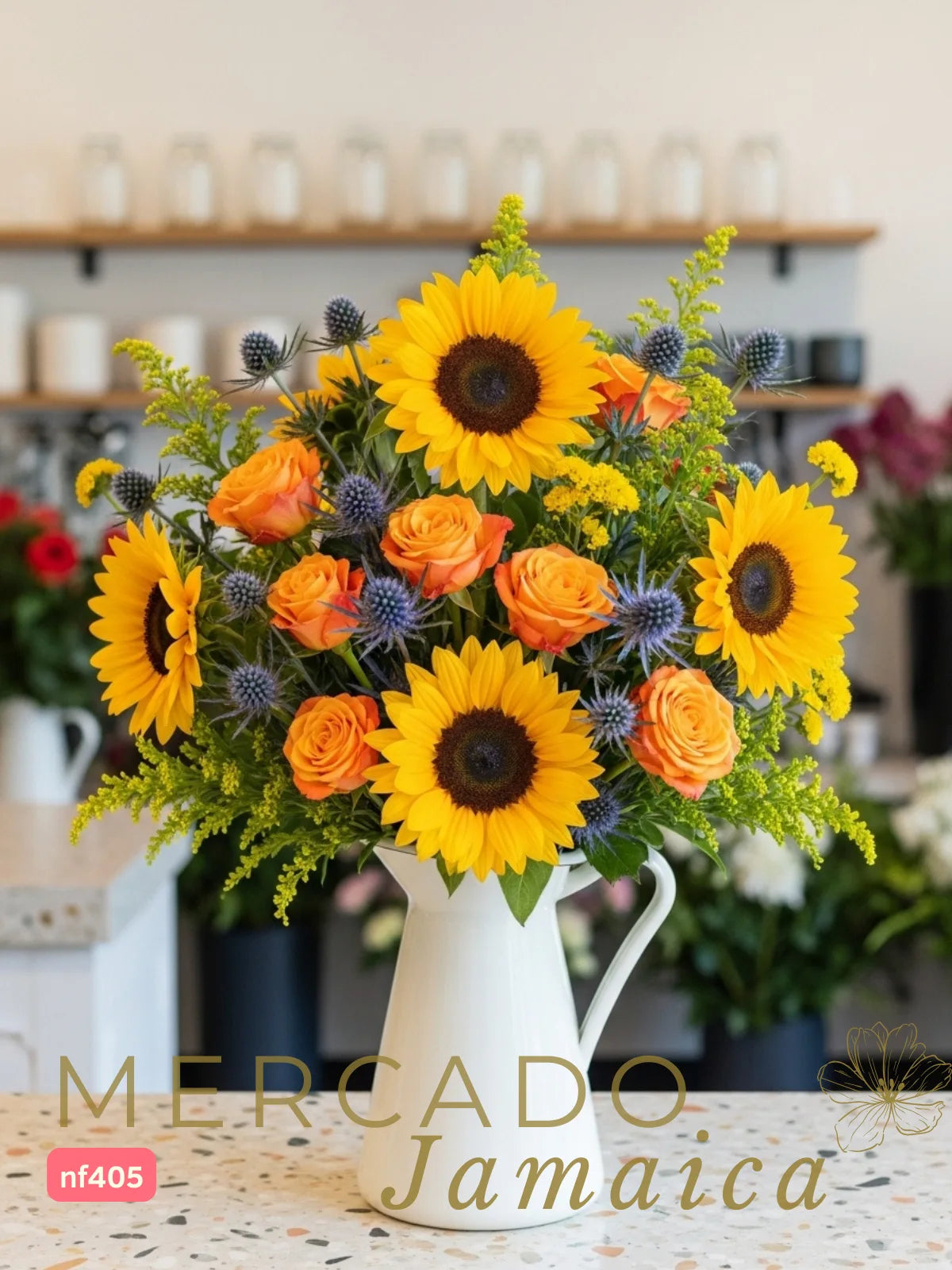Un arreglo floral vibrante que fusiona la energía del sol con un toque de serenidad y sofisticación. Ocho girasoles chicos simbolizan la adoración y la lealtad, mientras que las doce rosas naranja añaden un toque de encanto y entusiasmo. El diseño se complementa con follaje de eryngium azul, follaje de solidago y tallos de staticé morado, que aportan una combinación de texturas y colores únicos. Todo el conjunto se presenta en un florero de cerámica color blanco tipo jarra, ideal para un regalo inolvidable.