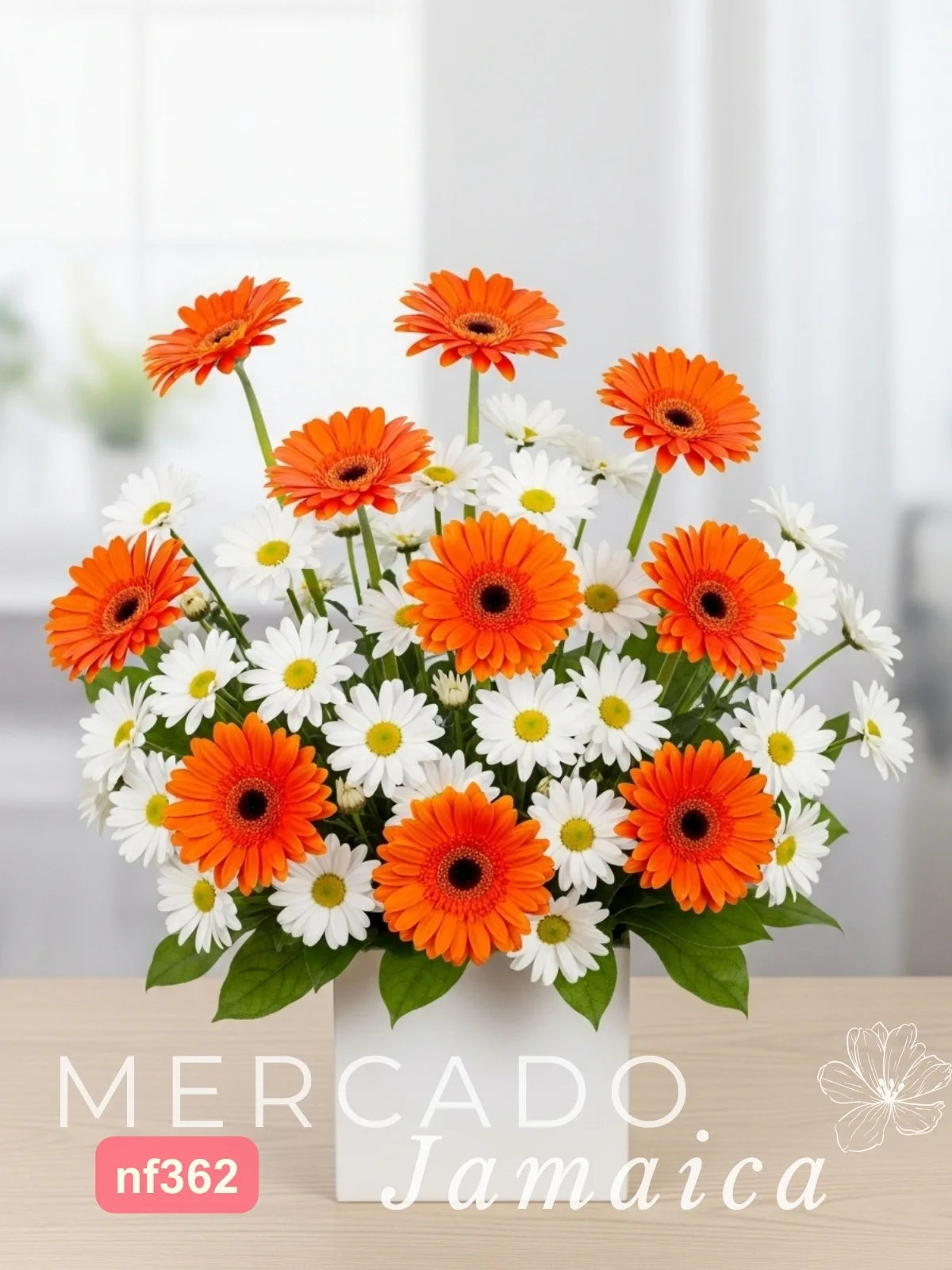 Un arreglo floral que evoca la vitalidad y la alegría con una mezcla de colores cálidos y radiantes. Diez gerberas naranja simbolizan la energía y el entusiasmo, mientras que las margaritas blancas añaden un toque de inocencia y simplicidad. El diseño se complementa con hojas decorativas que aportan un toque de frescura y originalidad. Presentado en un florero de cerámica tipo cubo con espuma floral, este arreglo es el regalo perfecto para celebrar cualquier ocasión especial con un estilo lleno de vida.