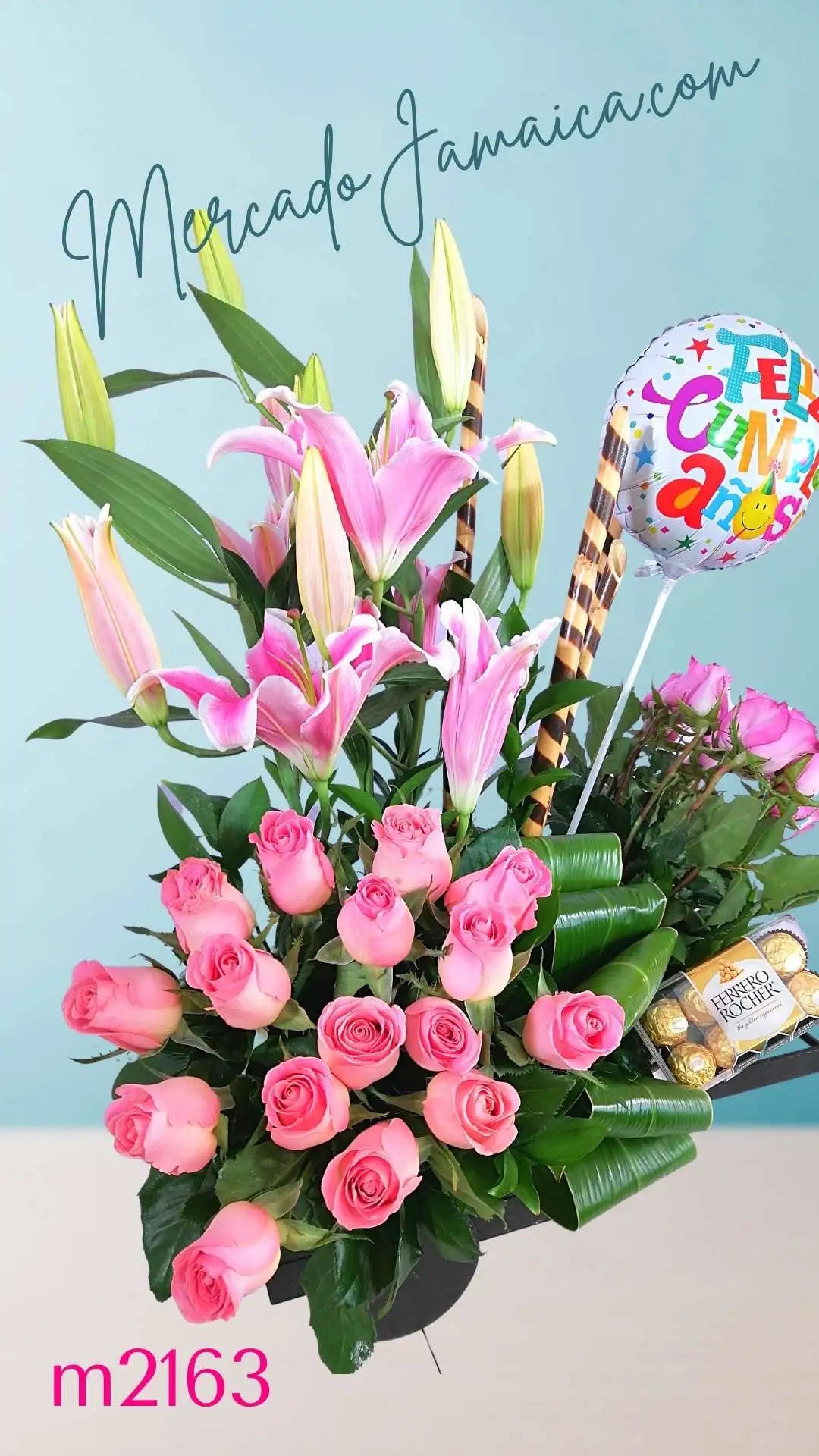 Descripción: Este impresionante arreglo floral en una encantadora carreta de madera es el regalo perfecto para sorprender a alguien especial. Incluye 12 rosas moradas y 12 rosas rosa hermosa, así como 5 tallos de flores acapulcos que aportan frescura y color. Además, añadimos una caja de chocolates Ferrero con 16 deliciosos bombones, hojas dracena, 3 carrizos cortos y un pequeño globo de 17 cm con un mensaje de "Te Quiero" o "Feliz Cumpleaños" para hacerlo aún más especial.