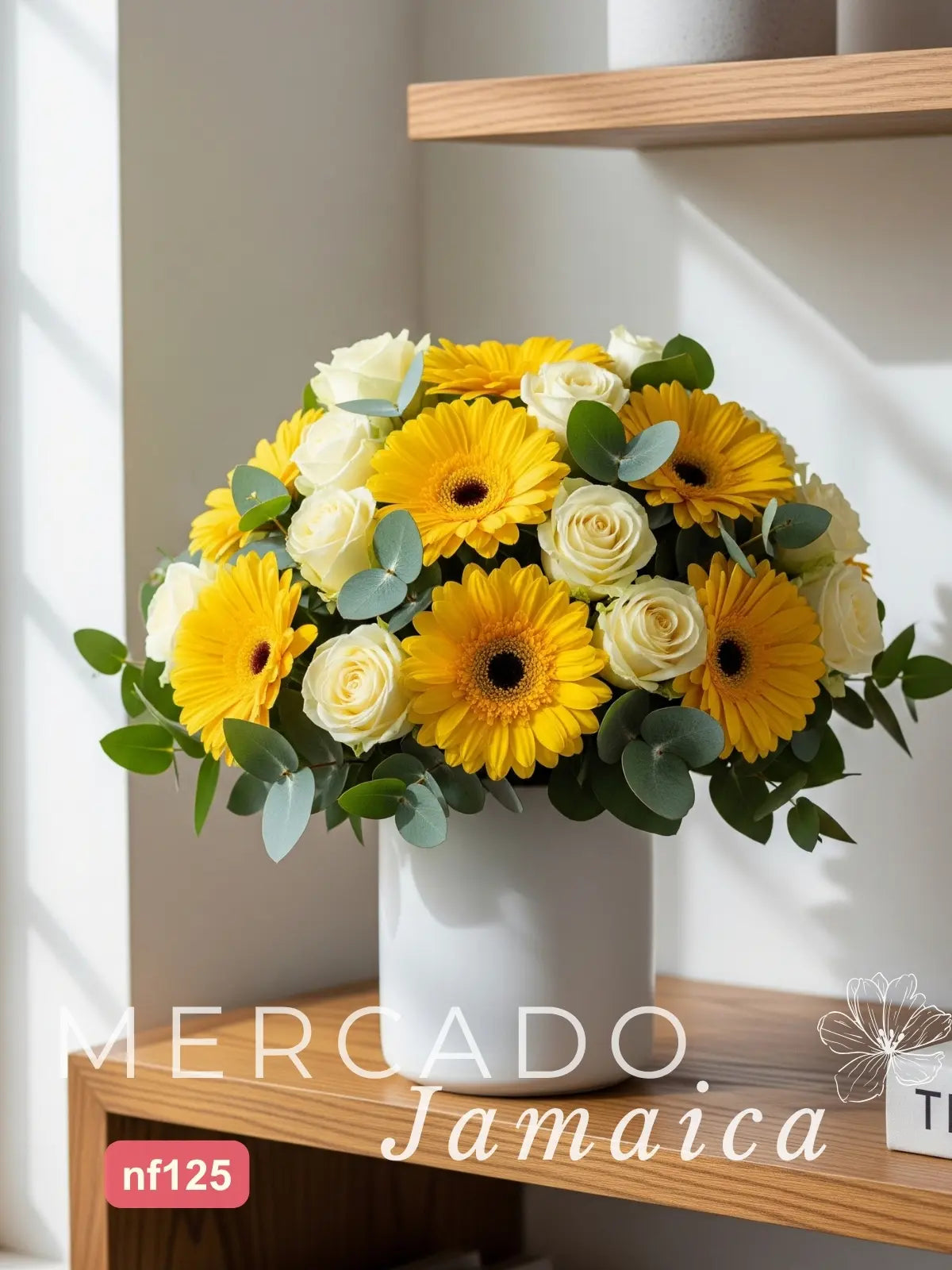 Diseñado para quienes aprecian los detalles, este arreglo fusiona la suavidad de las rosas claras con el optimismo de las gerberas amarillas. El florero rosa cilíndrico realza la feminidad del conjunto, mientras el follaje dólar mantiene un aire natural. Ideal para: