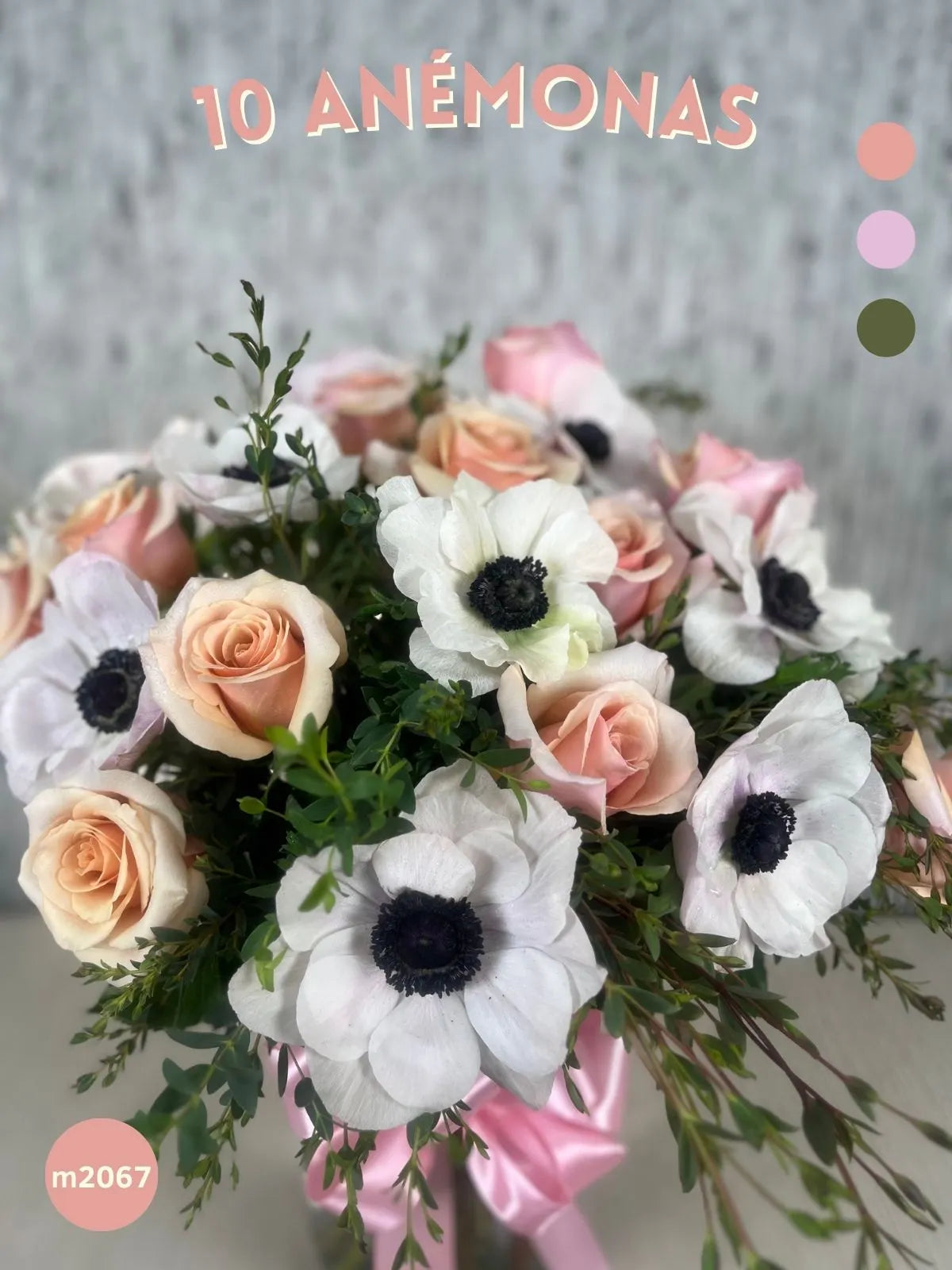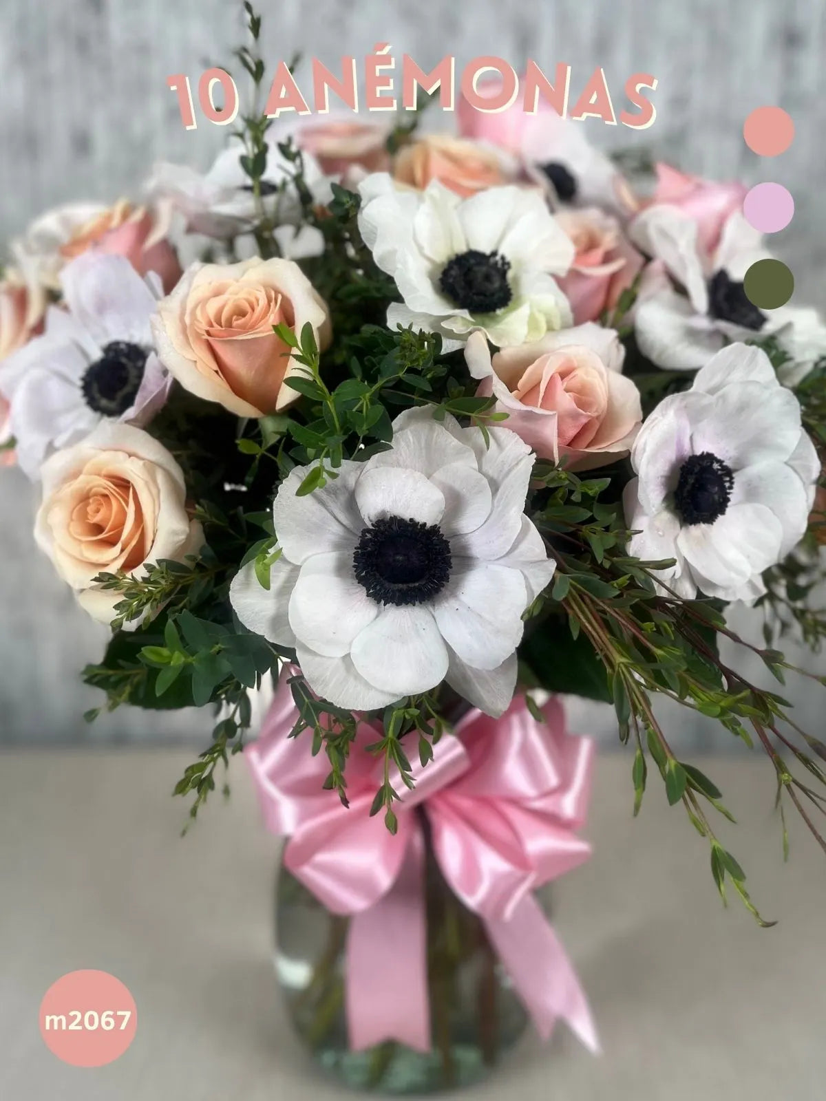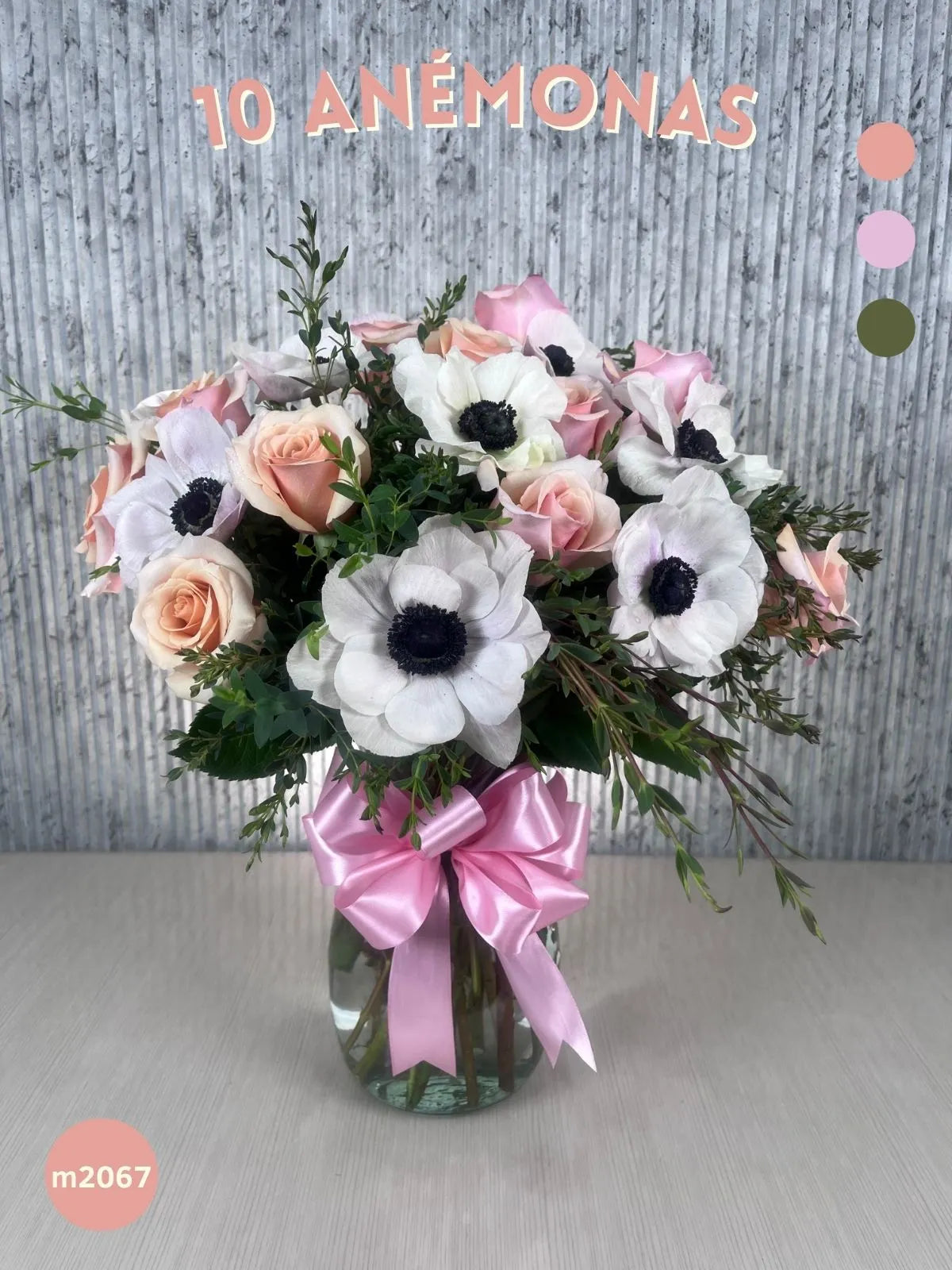 Un encantador arreglo floral que combina 10 anémonas de vibrantes colores con 12 rosas en tono rosa claro, creando una composición suave y armoniosa. El follaje parvifolia aporta un toque silvestre y elegante, complementando la frescura de las flores. Todo presentado en un florero de vidrio tipo jarrón, modelo Regis, que enmarca con estilo la belleza natural del arreglo. Ideal para realzar cualquier espacio o para regalar en momentos llenos de significado.