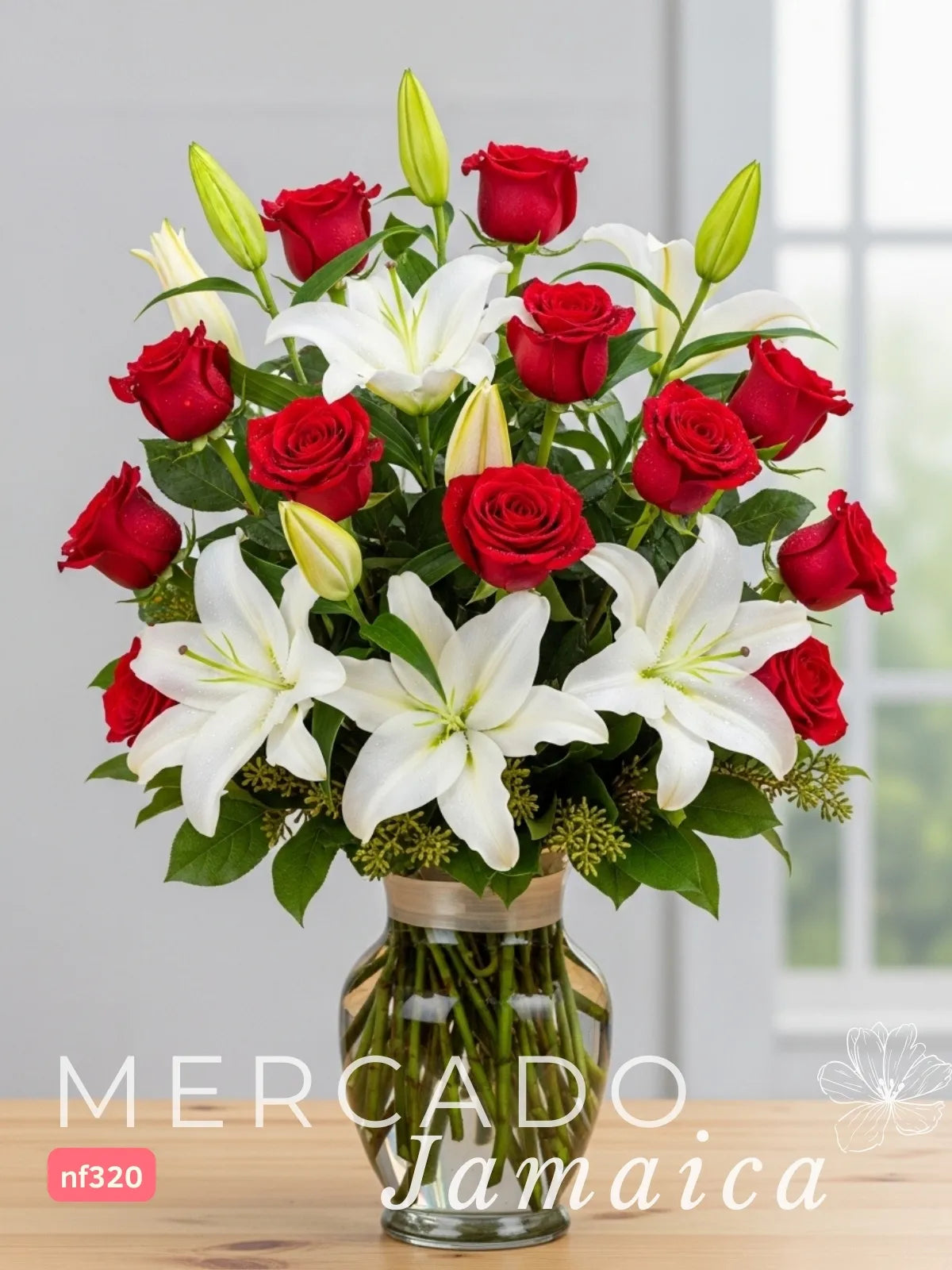 Este impresionante arreglo floral fusiona la ardiente pasión de dieciocho rosas rojas con la pura elegancia de cinco tallos de casablancas. La combinación crea un contraste visual impactante y lleno de simbolismo, ideal para expresar un amor profundo y puro. El diseño se presenta en un florero de vidrio tipo jarrón, un clásico que permite que la belleza de las flores resalte por sí misma.