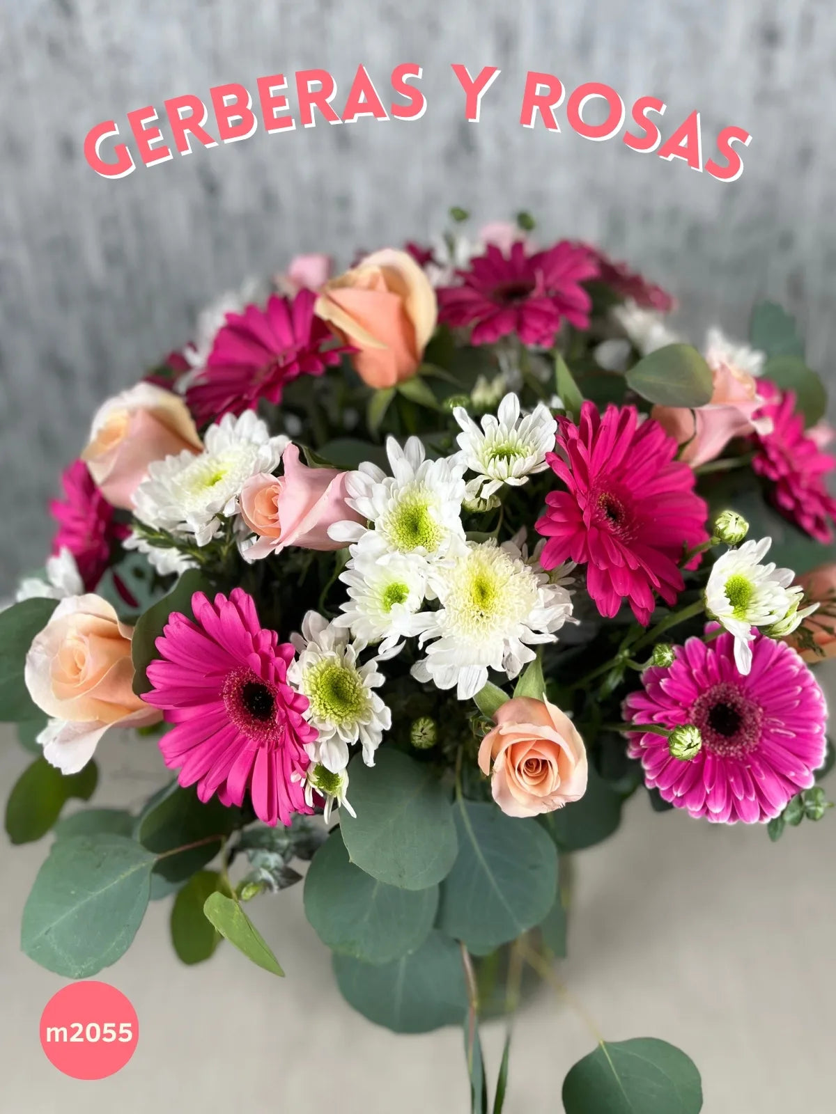 Un arreglo elegante y alegre que combina gerberas fucsia llenas de energía, rosas claras que transmiten ternura y radots blancos que aportan luz y equilibrio. Su composición vertical en florero de vidrio lo hace ideal para colocar en mesas, escritorios o recibidores sin ocupar demasiado espacio, pero destacando con presencia.