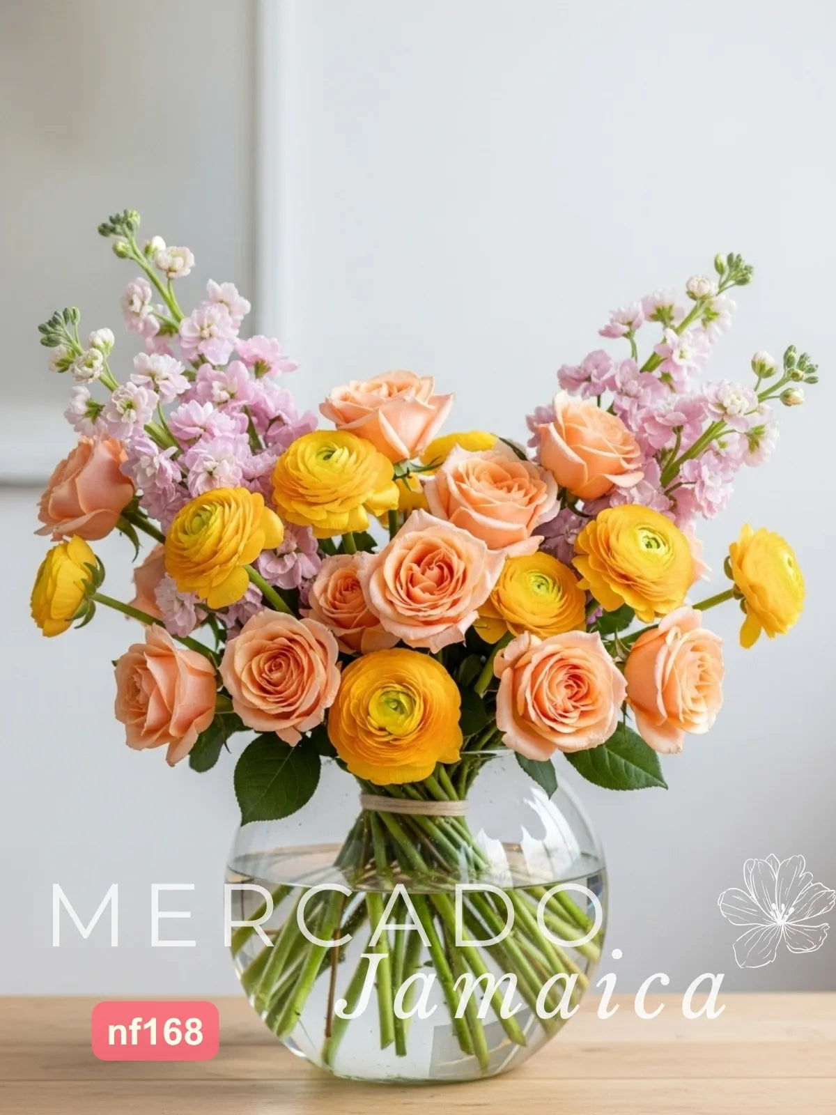 Un diseño que irradia la calidez de un abrazo sincero. 24 rosas en tonos durazno se combinan con la alegría de 10 ranúnculos amarillos y el dulce perfume de las matthiolas. Presentado en un florero esférico, es un regalo que ilumina cualquier espacio y corazón.