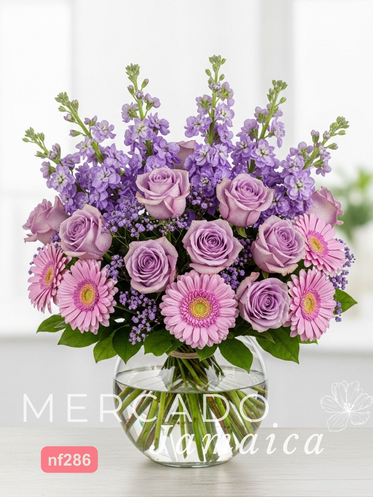 Sumérgete en un sueño color lavanda con este diseño monocromático. 24 rosas, 10 alegres gerberas y el dulce perfume de 8 matthiolas se unen en una sinfonía de tonos lilas. Un arreglo que inspira calma y felicidad, presentado en un moderno florero esférico.