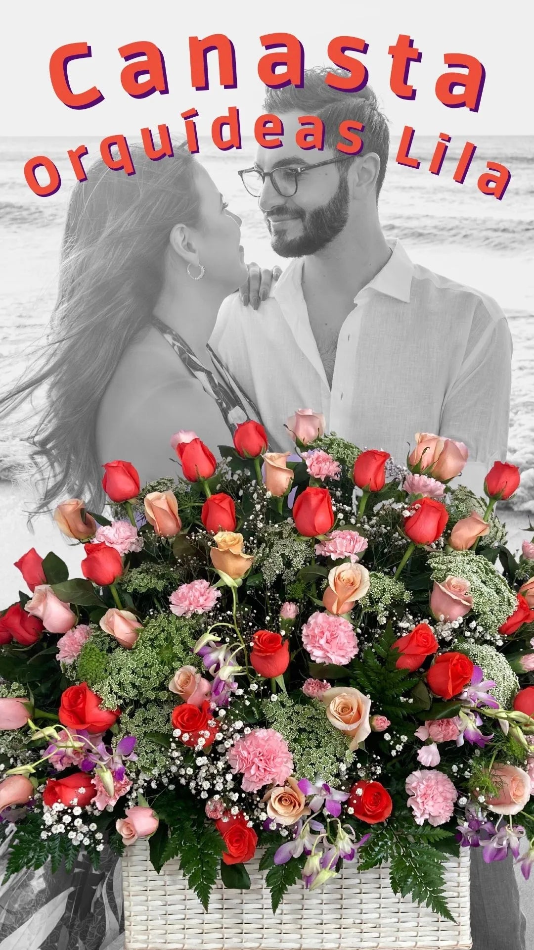 Canasta de flores rosas naranja con orquídeas lila es una impresionante canasta que combina 24 rosas naranja, 10 orquídeas dendrobium lila, 10 gypsophilia, 10 akilea/trachelium blanco, 10 claveles rosa, 18 rosas rosa, leather, piñanonas y espuma floral. Esta canasta grande blanca es perfecta para expresar amor y gratitud..
