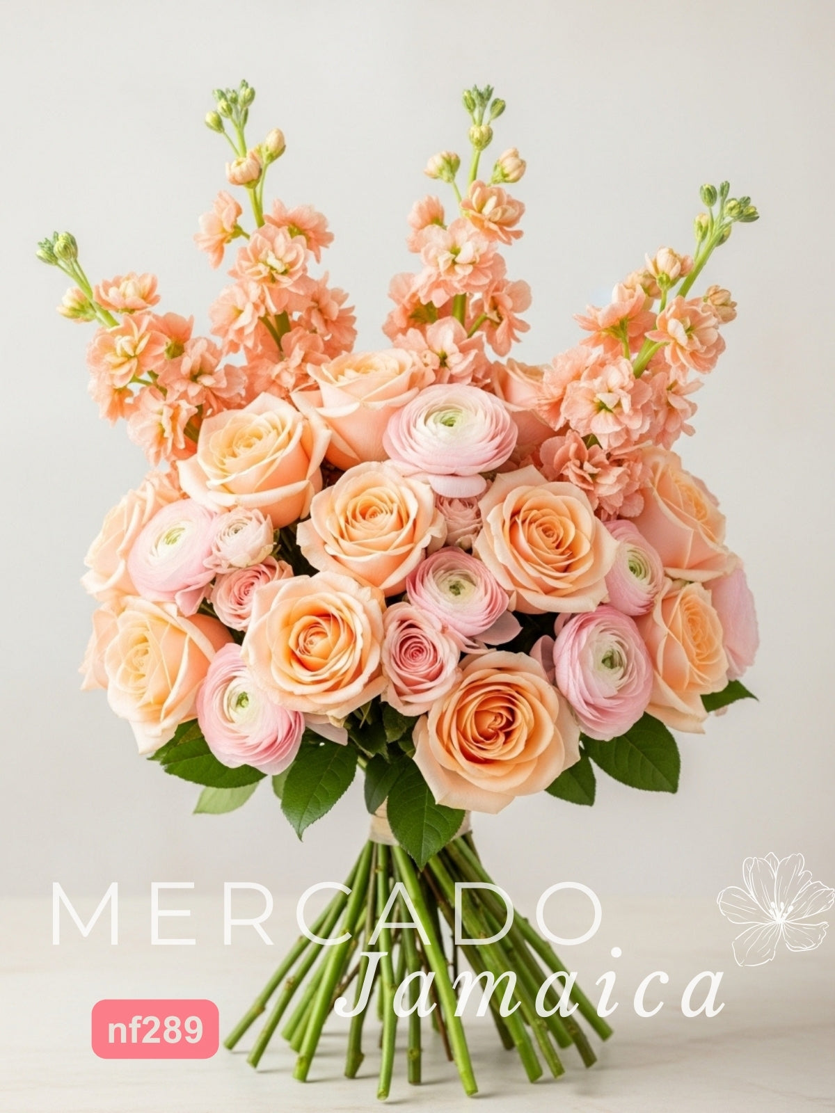 Un diseño que envuelve en la calidez de un atardecer. 24 hermosas rosas durazno se combinan con la delicadeza de 10 ranúnculos rosas, mientras el dulce perfume de las matthiolas inunda el ambiente. Un regalo que es un abrazo floral, lleno de ternura y buenos deseos.