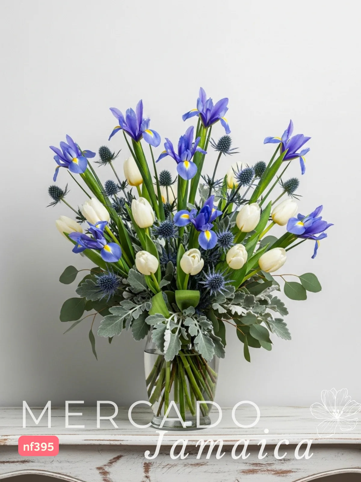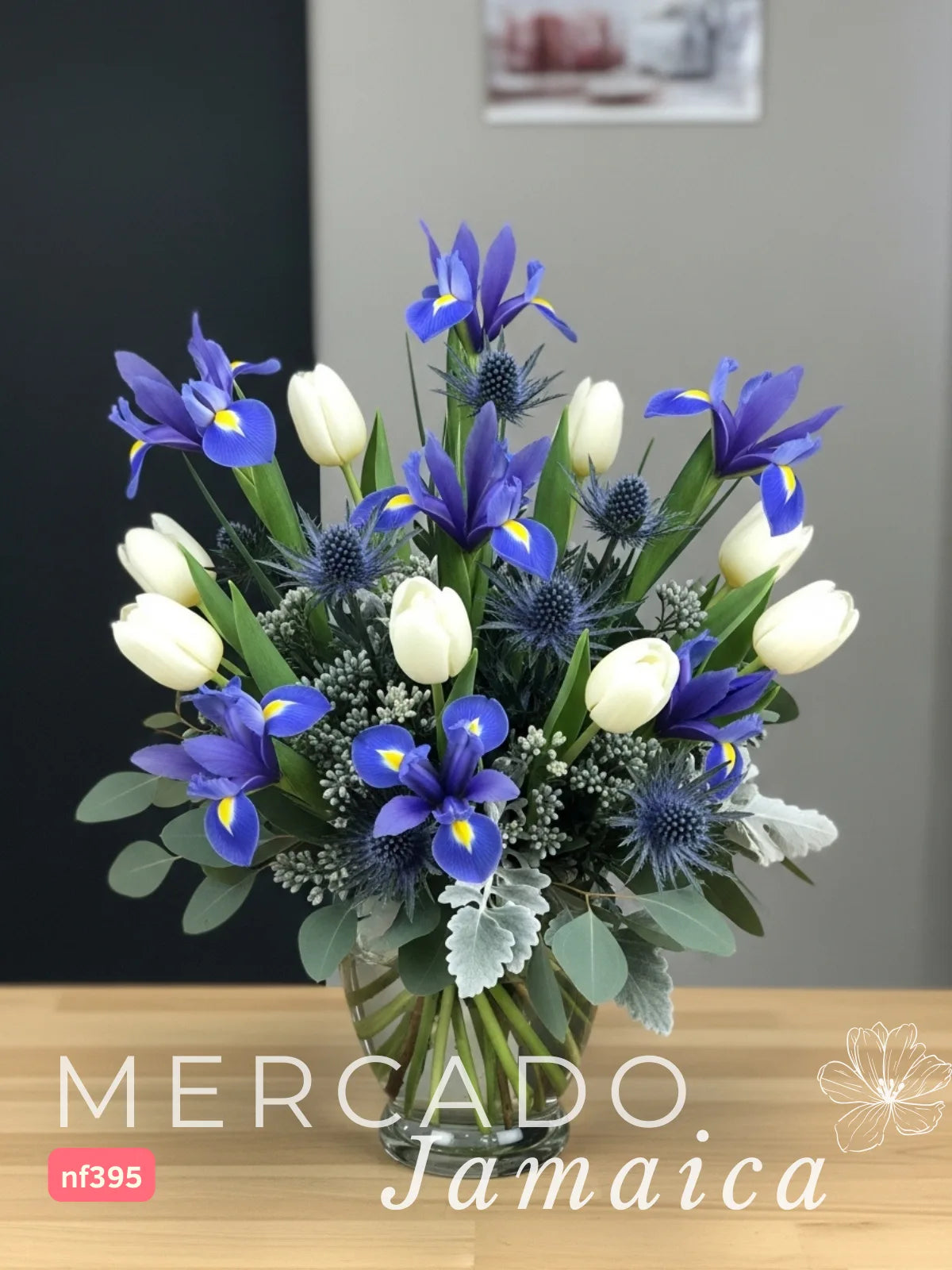 Un arreglo floral que evoca pureza y serenidad con una combinación de texturas y formas en tonos de azul y blanco. Diez iris azul y eryngium azul aportan un toque de misterio y elegancia, mientras que diez tulipanes blancos añaden un toque de gracia y modernidad. El follaje de dusty miller complementa el diseño con su suave textura. Todo el conjunto se presenta en un florero de vidrio tipo jarrón, ideal para un regalo memorable o para decorar cualquier espacio con un toque de paz y serenidad.