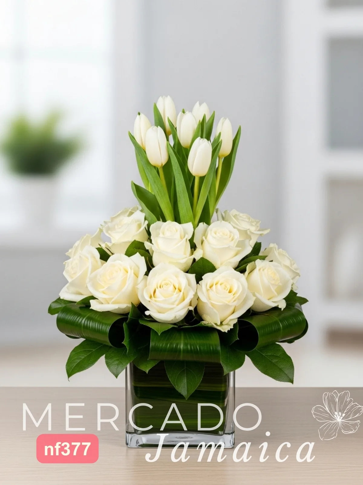 Un arreglo floral que celebra la pureza y la elegancia con una combinación de texturas y formas en un solo color. Diez tulipanes blancos, que simbolizan la gracia y la modernidad, se fusionan con la inocencia de veinticuatro rosas blancas. El diseño se presenta en un sofisticado florero de vidrio tipo cubo, ideal para un regalo memorable o para decorar cualquier espacio con un toque de paz y serenidad.