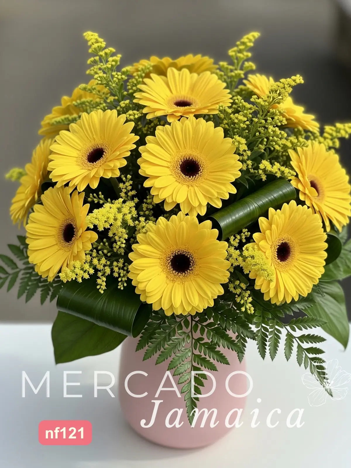 Las gerberas amarillas, conocidas por su capacidad de purificar el aire, toman protagonismo en este diseño, acompañadas por follaje airy y hojas brillantes que crean movimiento. El florero rosa añade un toque de ternura sin caer en lo infantil, perfecto para: