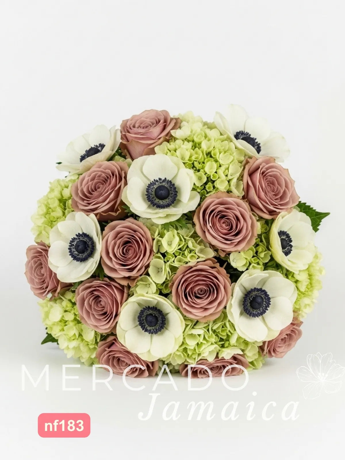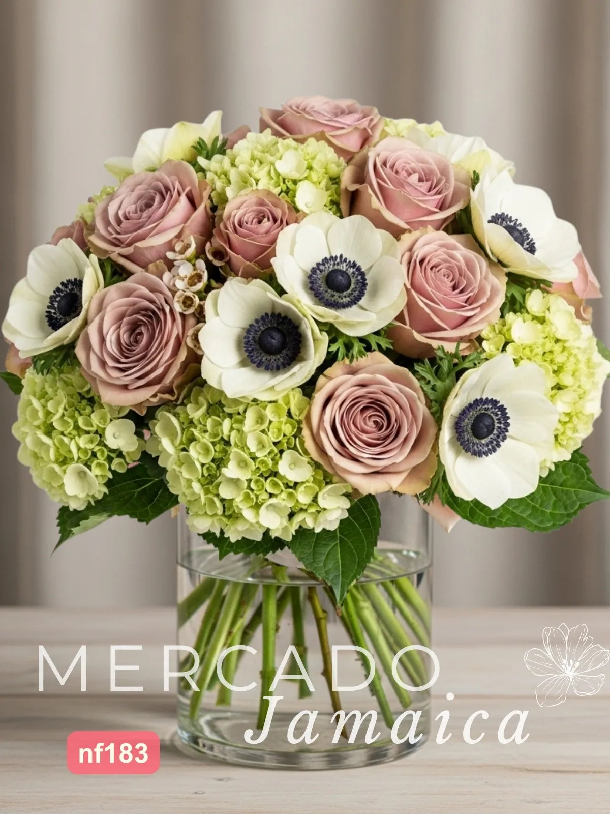 Un diseño de sofisticación única, protagonizado por 24 exclusivas rosas 'Amnesia' en un enigmático tono malva. El contraste audaz de 10 anémonas blancas y la frescura de las hortensias verdes crean una composición inolvidable. Presentado en un florero esférico, es el regalo perfecto para un gusto exquisito.