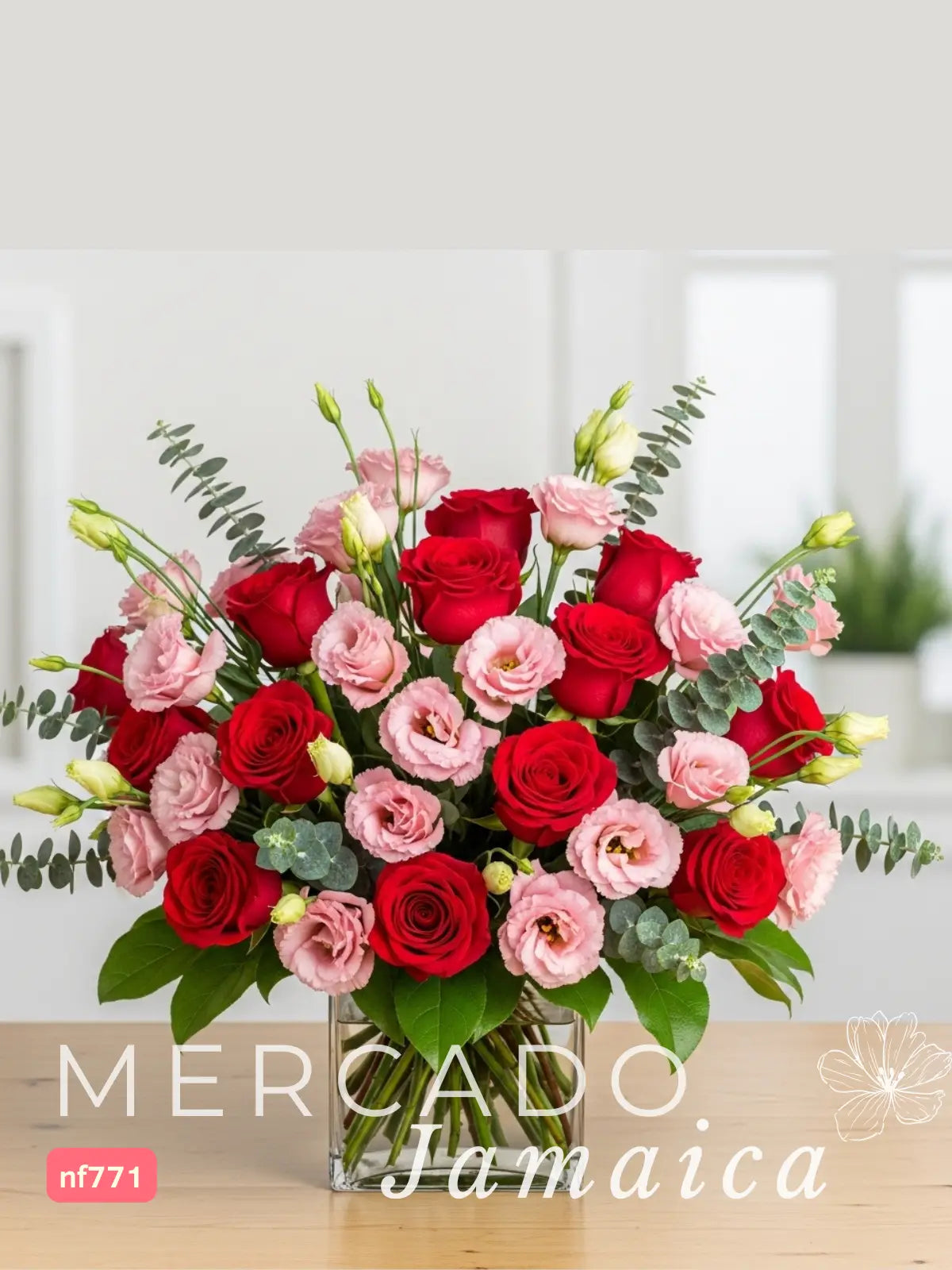 Poético y lleno de emoción. "Opulencia" hace referencia a la gran cantidad de flores, mientras que "caricias" se asocia con el lisianthus rosa y su suave tacto. El "fuego encendido" es un toque dramático que alude a la pasión de las rosas rojas.