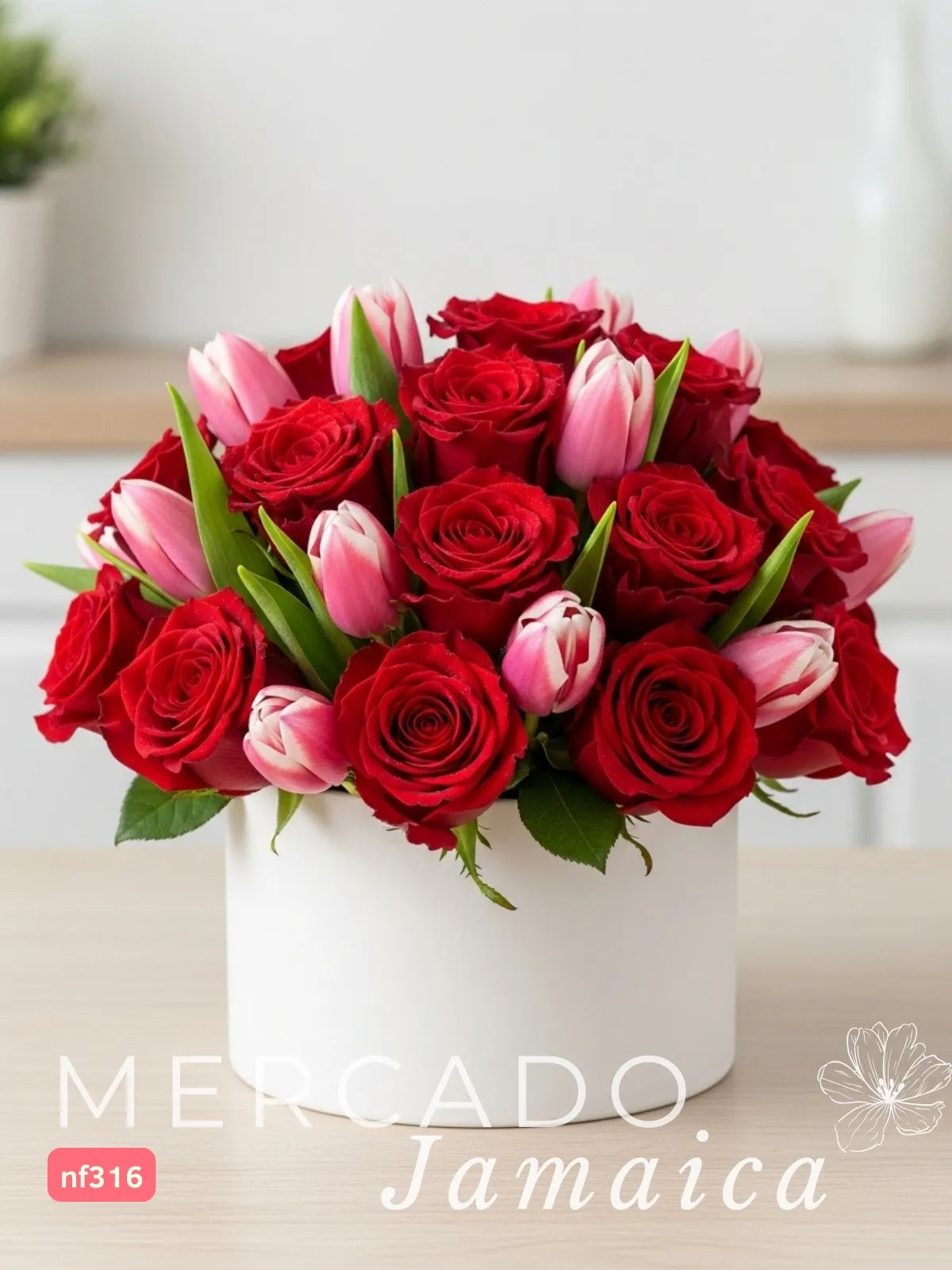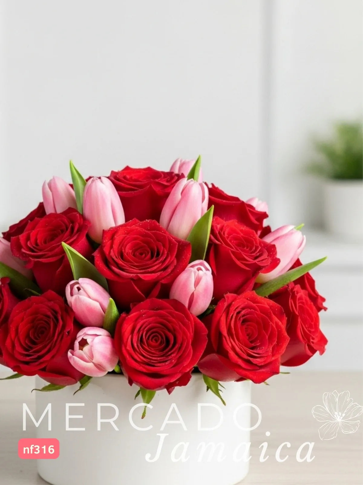 Un arreglo floral que une la pasión de veinticuatro rosas rojas con la delicada elegancia de diez tulipanes rosa. Esta combinación crea una composición vibrante y armoniosa, perfecta para expresar sentimientos profundos. Las flores se presentan en un florero de cerámica bajo tipo cilindro, y la espuma floral garantiza que mantengan su frescura y esplendor por más tiempo.
