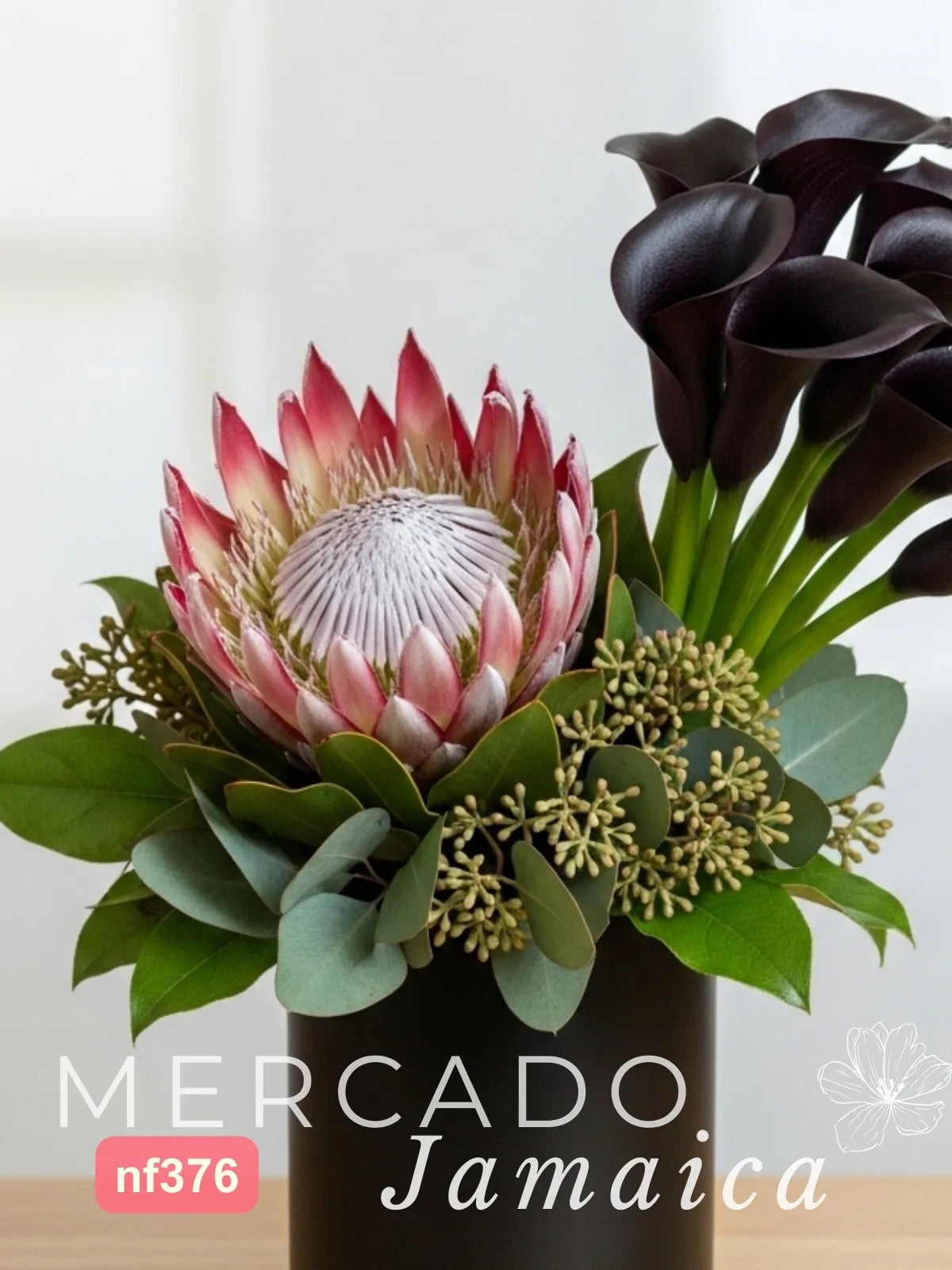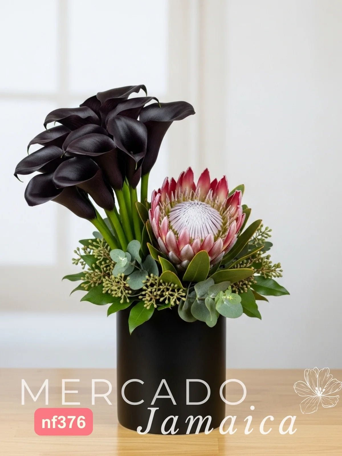 Un arreglo floral audaz y sofisticado que fusiona la majestuosidad de una protea king con la misteriosa elegancia de diez callas negras. El diseño se complementa con la textura rústica de tallos de eucalipto semillado, que añaden un aroma y carácter únicos. Presentado en un florero de cerámica color negro con una malla metálica, este arreglo es un regalo inolvidable, lleno de dramatismo y distinción, perfecto para un estilo moderno y audaz.