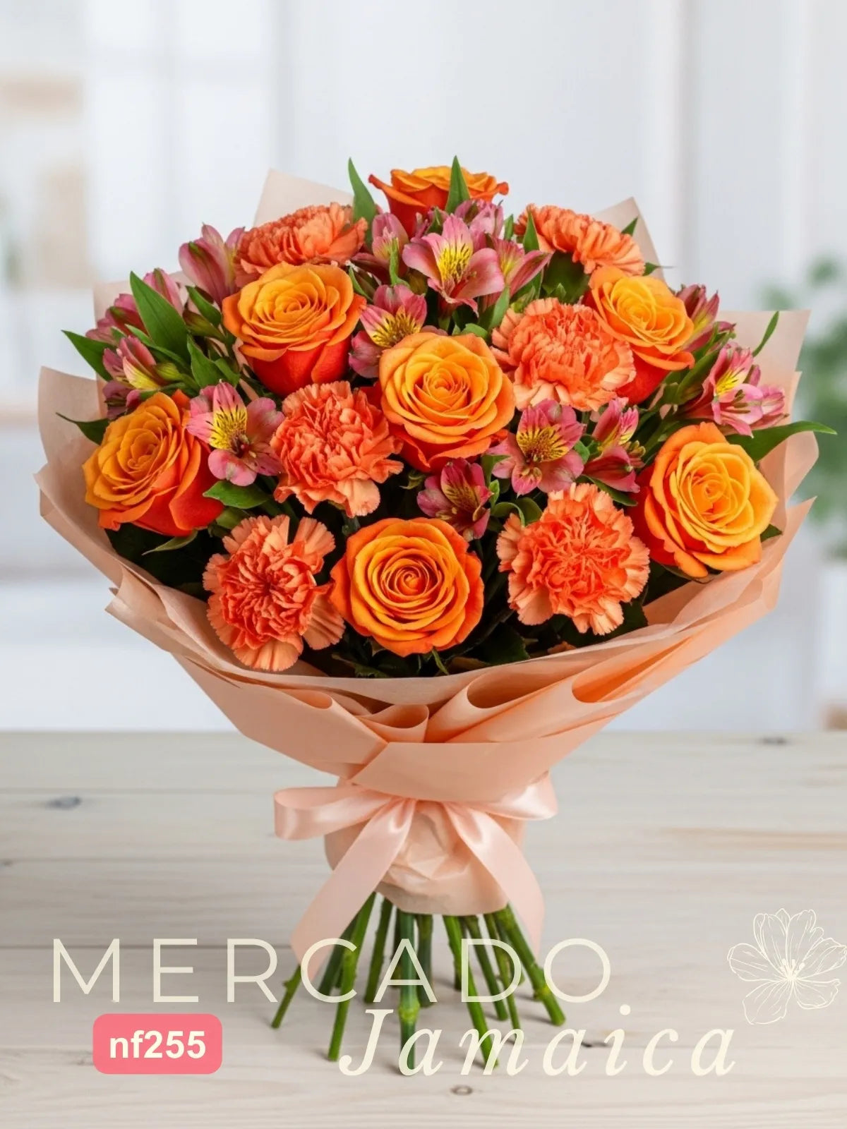 Doce rosas de un espectacular color naranja son el corazón de este arreglo. Su tonalidad, que evoca la calidez de un atardecer, simboliza el entusiasmo y la fascinación. A su lado, diez claveles naranja aportan una textura esponjosa y un volumen generoso, reforzando la energía positiva del conjunto. Para añadir un toque de dulzura y crear una armonía de colores análogos, diez tallos de alstroemerias rosas se entrelazan en la composición, aportando delicadeza y el simbolismo de una amistad duradera.