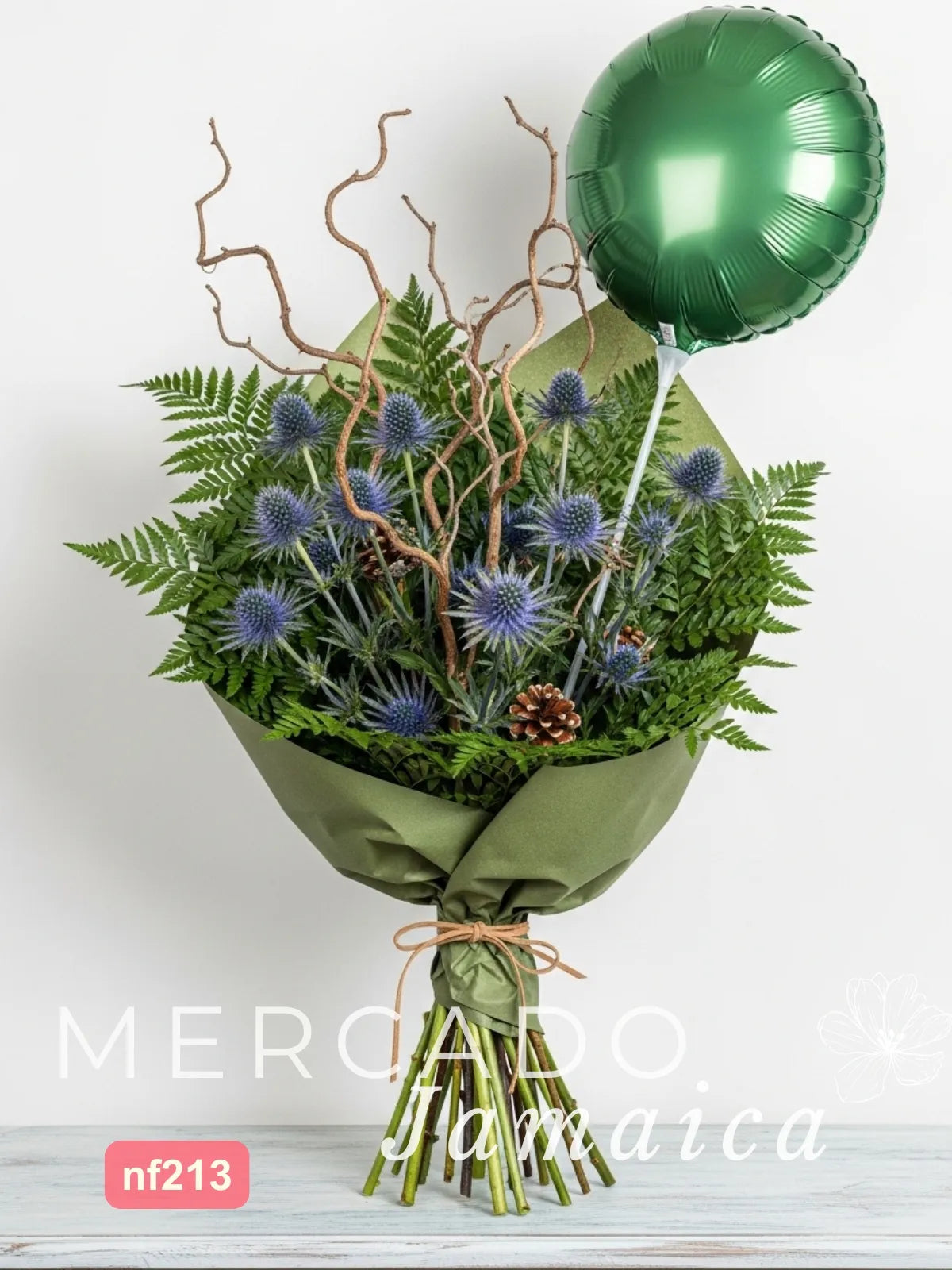 Un diseño que rompe con lo tradicional. Este ramo es una pieza de arte floral, ideal para quien aprecia la fuerza y la estructura. La belleza escultórica del eryngium azul, usada en diseños de vanguardia, se combina con las líneas dramáticas del 'curly' y la base sólida que aporta el follaje leather. Una composición de líneas y texturas, envuelta en papel de seda y con un globo metálico que subraya su carácter festivo y contemporáneo.