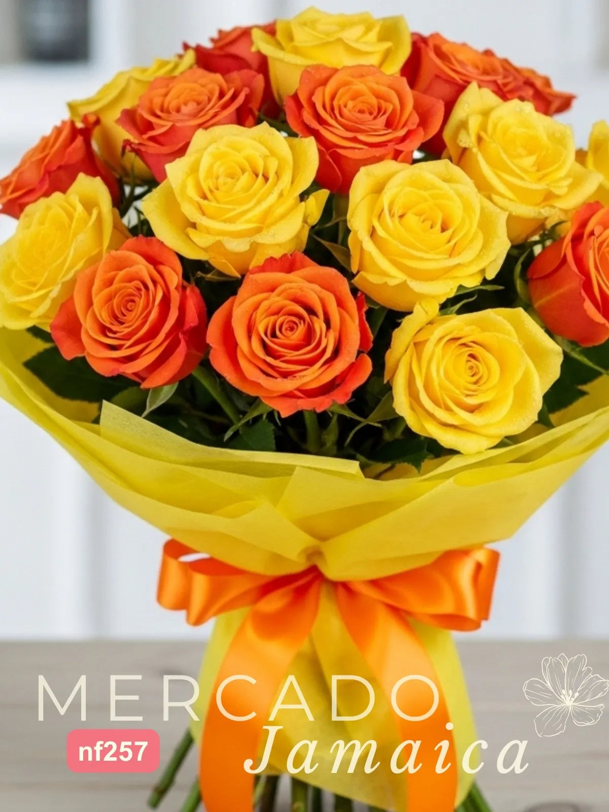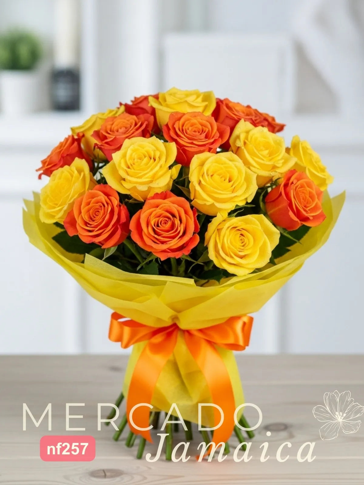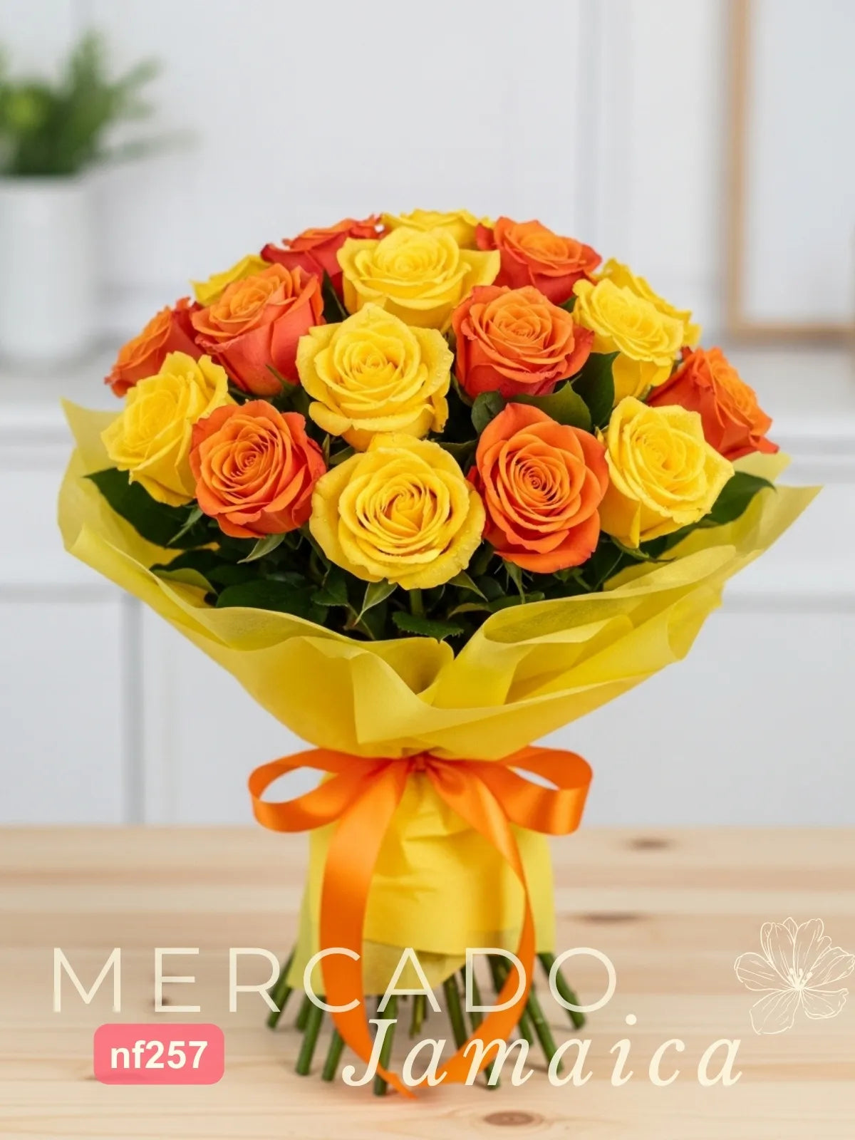 Veinticuatro rosas de calidad premium se combinan en una danza de colores cálidos. Doce rosas de un naranja intenso y vibrante, de variedades como 'Orange Crush', simbolizan el entusiasmo y la fascinación. Se entrelazan a la perfección con doce rosas de un amarillo solar, de variedades como 'Tara' o 'Brighton', un color que transmite un mensaje inequívoco de alegría y amistad. Esta armonía análoga de tonalidades vecinas crea un efecto visualmente impactante, una composición sutil y armoniosa.